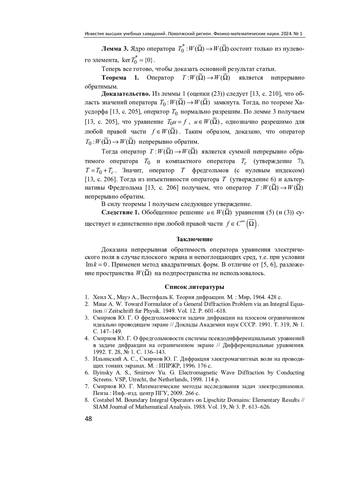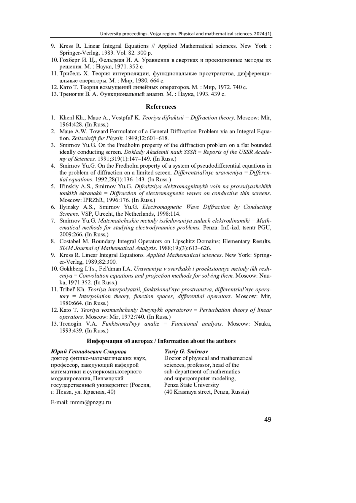 3. Смирнов Ю. Г. О фредгольмовости задачи дифракции на плоском ограниченном идеально проводящем экране // Доклады Академии наук СССР. 1991. Т. 319, № 1. С. 147-149.