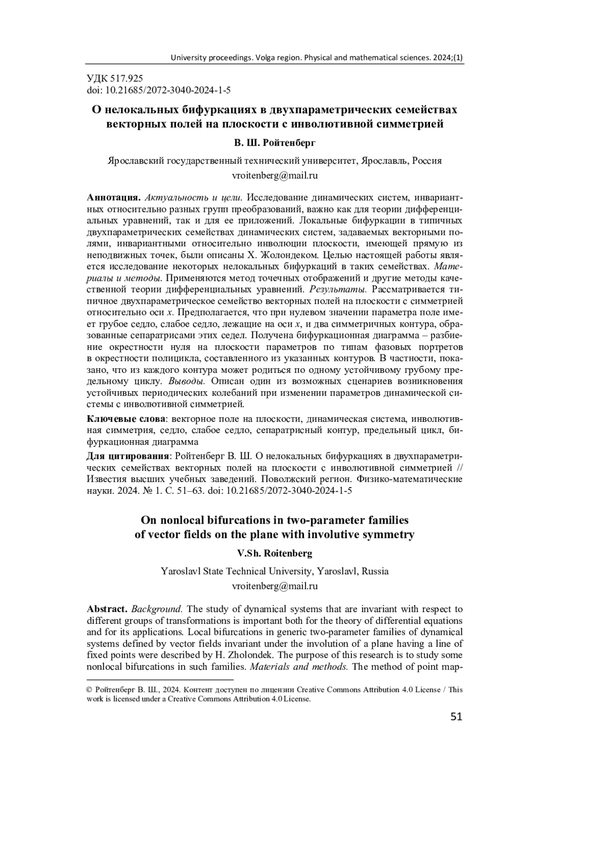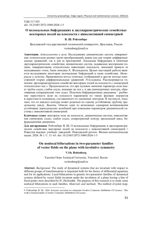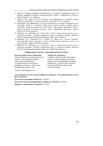 8. Ройтенберг В. Ш. Бифуркации полицикла, образованного двумя петлями сепаратрис негрубого седла динамической системы с центральной симметрией // Вестник Южно-Уральского государственного университета. Серия: Математика, Механика, Физика. 2021. Т. 13, № 3. С. 39-46. EDN: SCPOHG