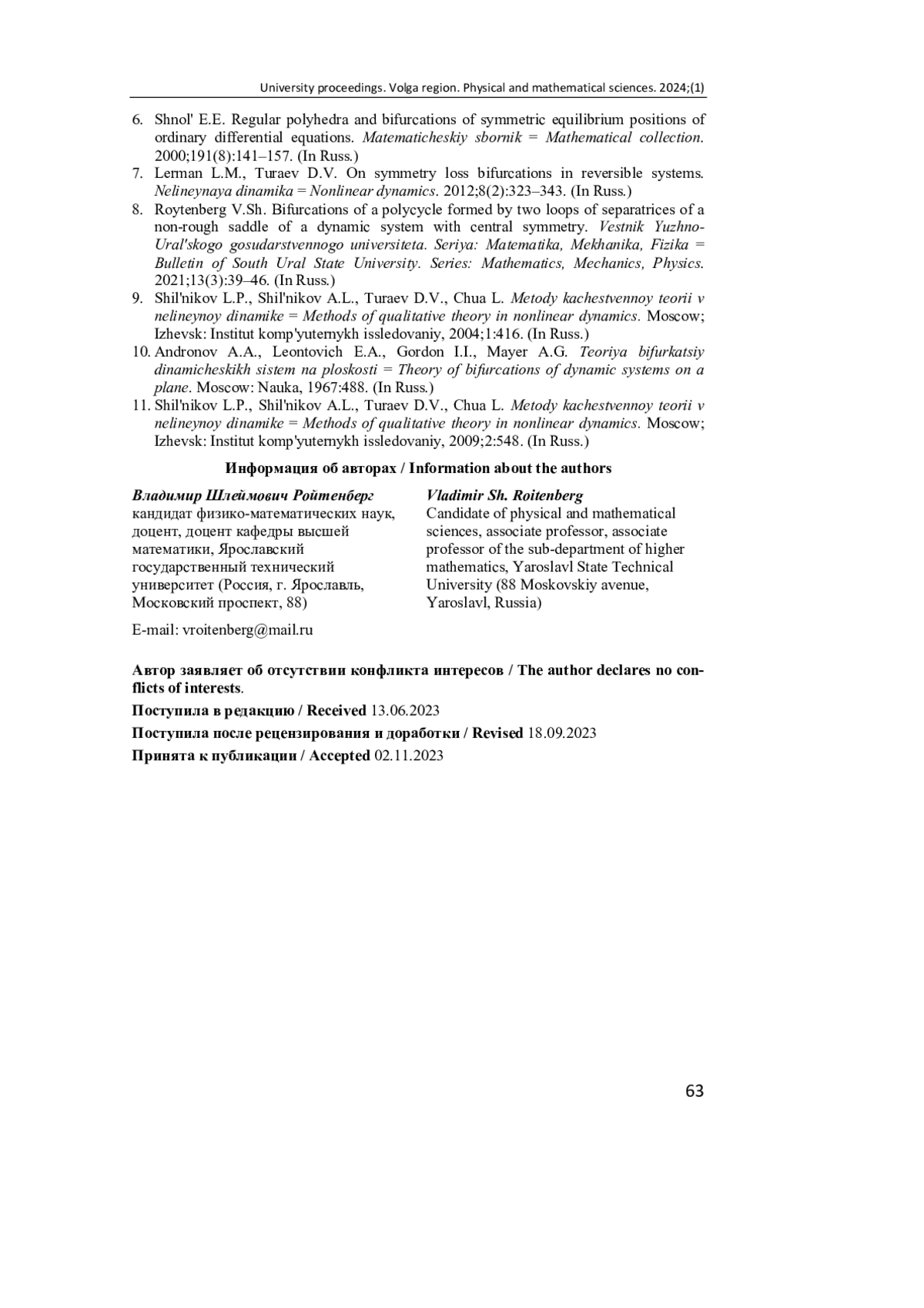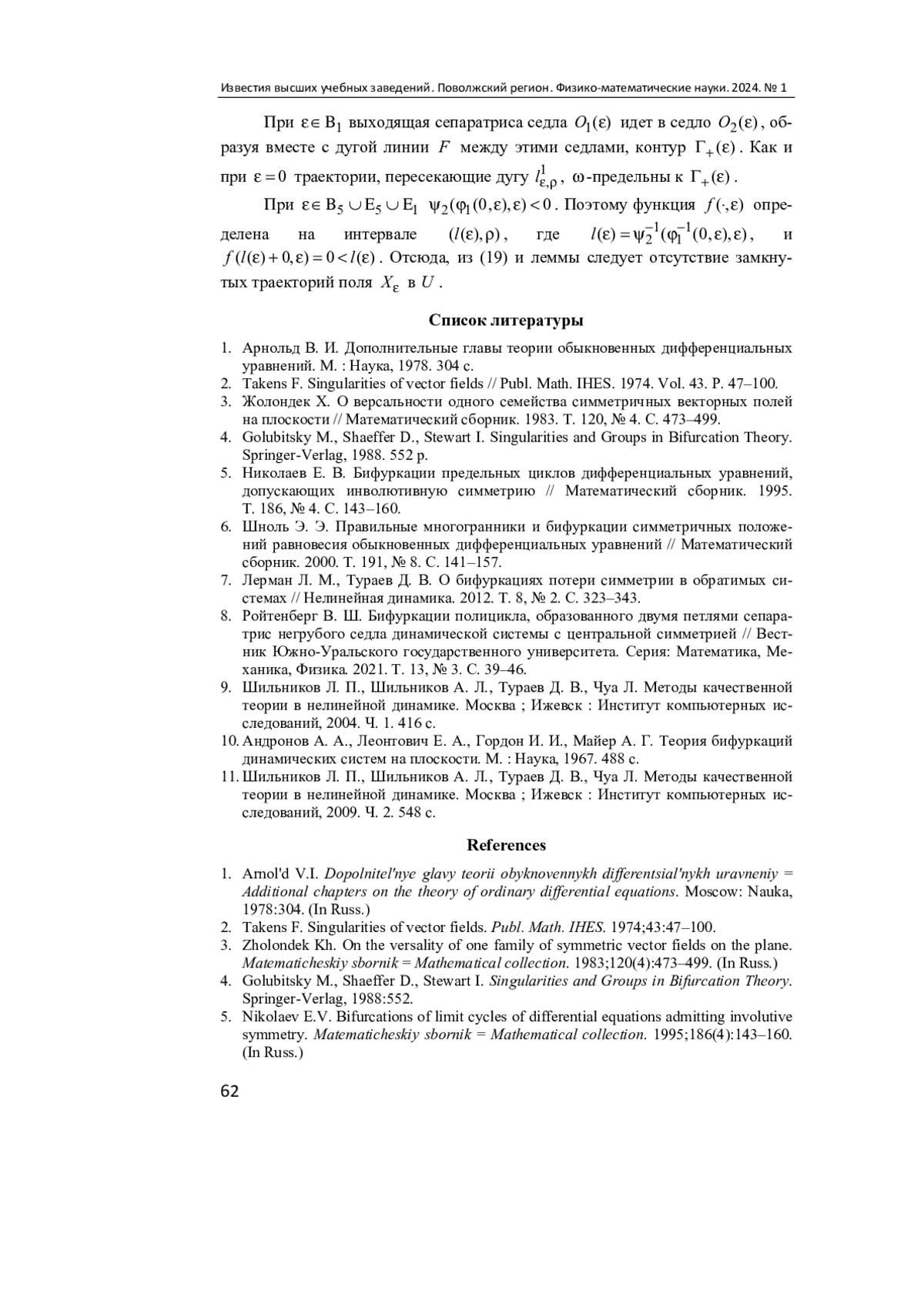 7. Лерман Л. М., Тураев Д. В. О бифуркациях потери симметрии в обратимых системах // Нелинейная динамика. 2012. T. 8, № 2. С. 323-343. EDN: OYPUCT