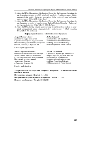 11. Лапич А. О., Медведик М. Ю. Итерационная схема решения нелинейного интегрального уравнения типа Липпмана - Швингера методом Галеркина // Известия высших учебных заведений. Поволжский регион. Физико-математические науки. 2023. № 3. С. 66-73. EDN: HVKSCY