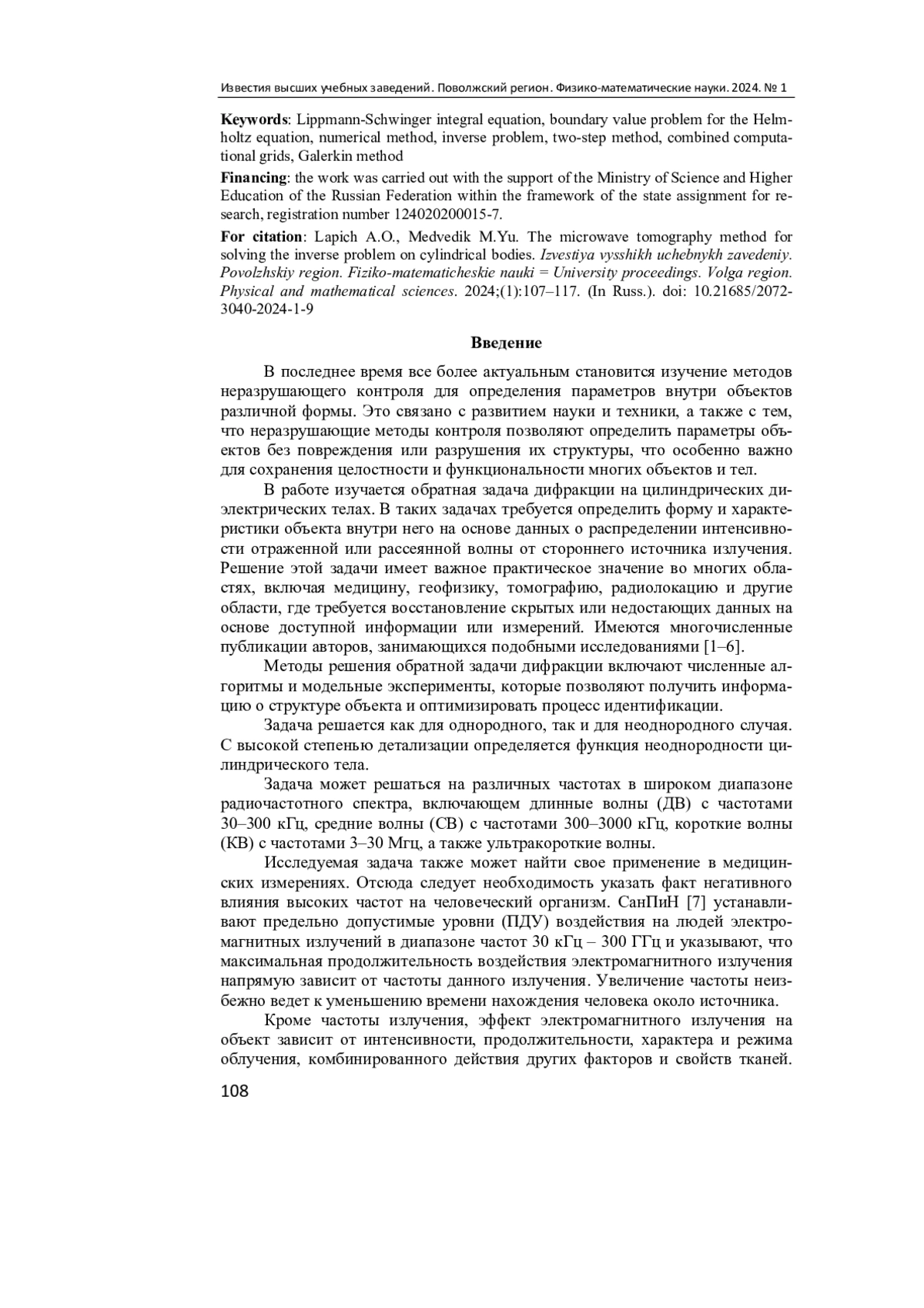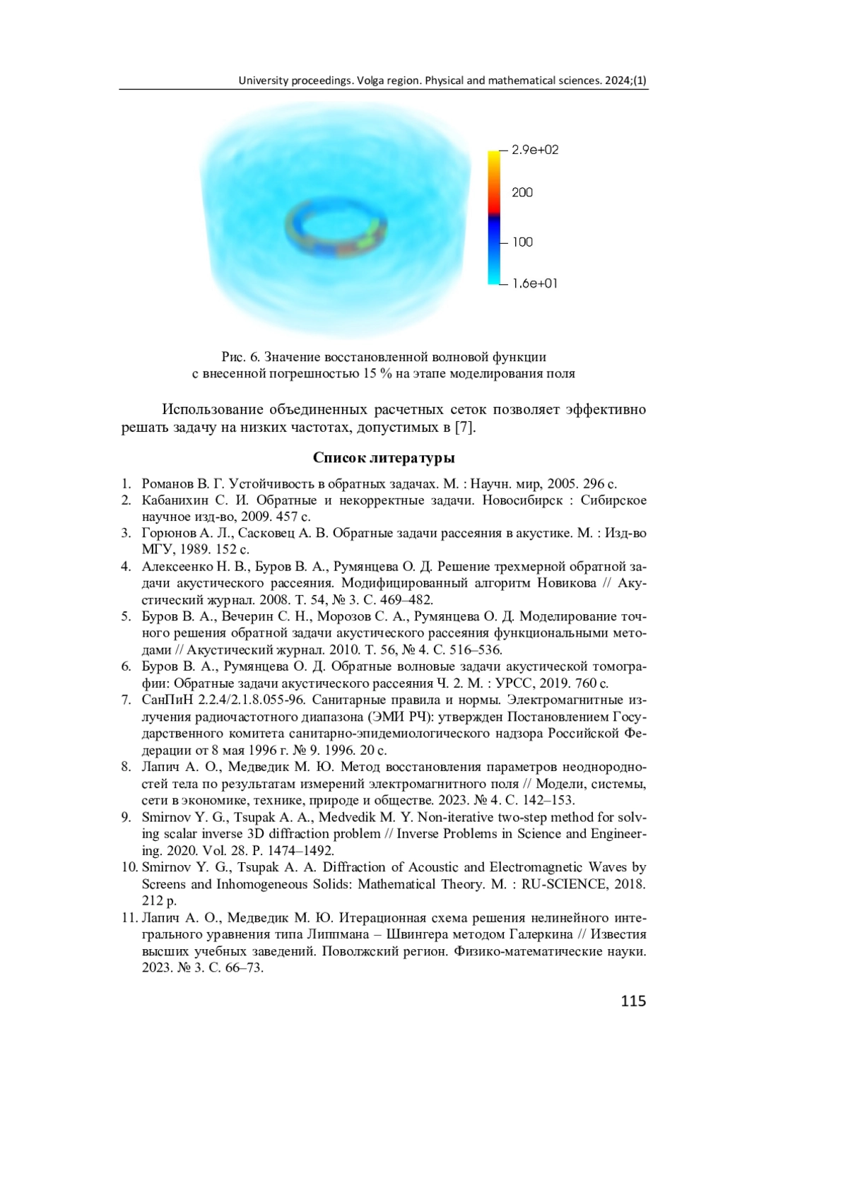 8. Лапич А. О., Медведик М. Ю. Метод восстановления параметров неоднородностей тела по результатам измерений электромагнитного поля // Модели, системы, сети в экономике, технике, природе и обществе. 2023. № 4. С. 142-153. EDN: XEGKGE