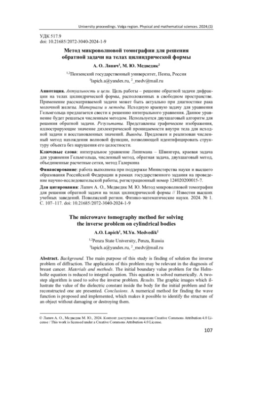 12. Лапич А. О., Медведик М. Ю. Решение скалярной двумерной нелинейной задачи дифракции на объектах произвольной формы // Ученые записки Казанского университета. Серия: Физико-математические науки. 2023. Т. 165, № 2. С. 166-176. EDN: TZEJOW