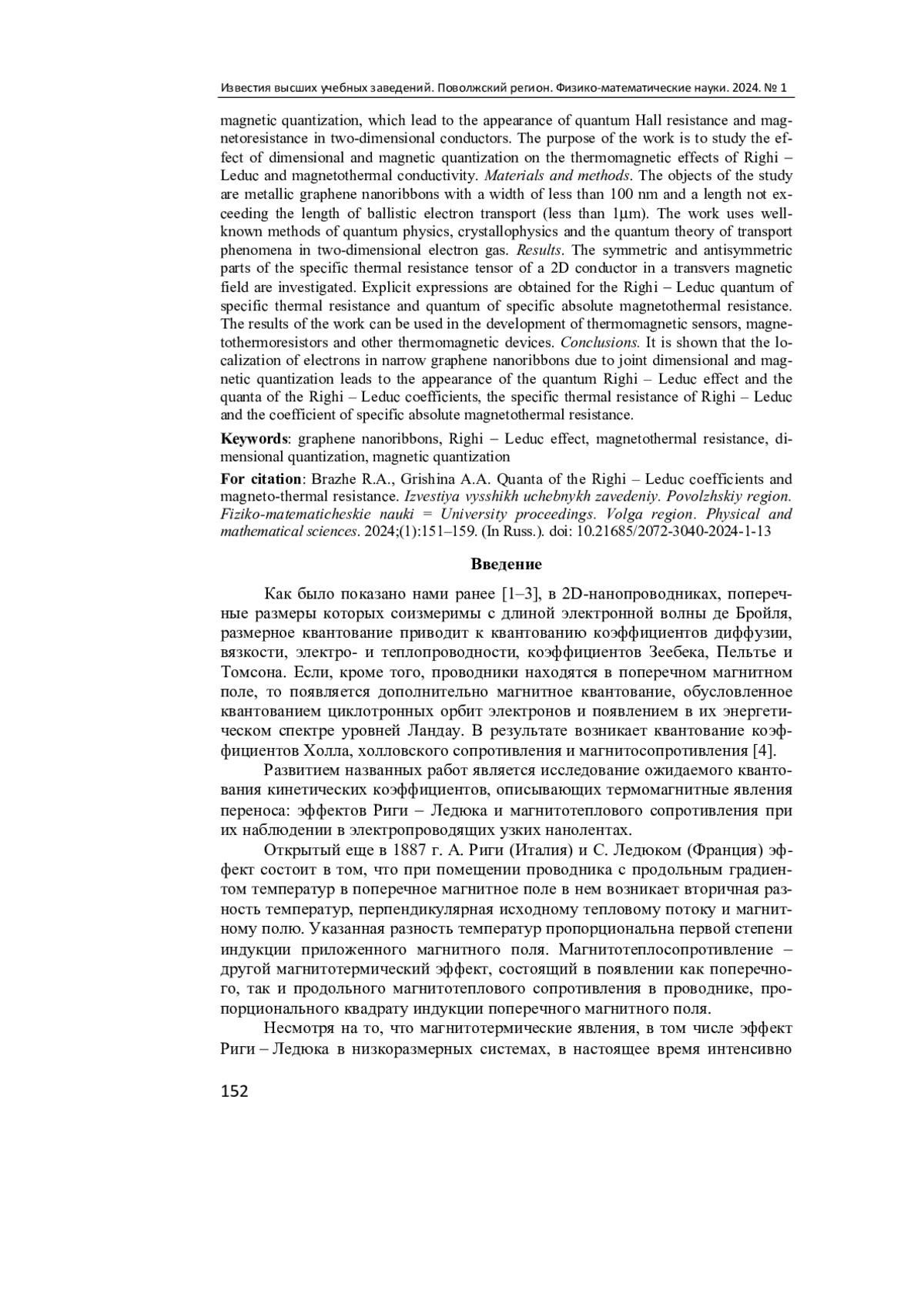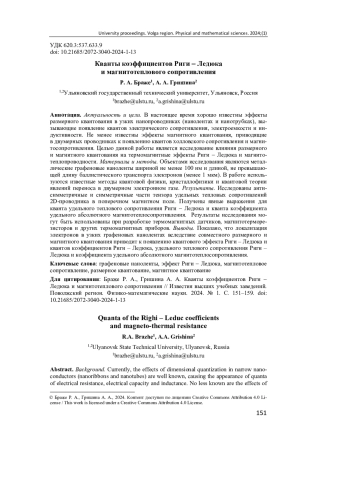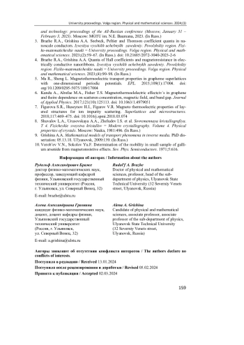 4. Браже Р. А., Гришина А. А. Кванты коэффициентов Холла и магнитосопротивления в электропроводящих нанолентах // Известия высших учебных заведений. Поволжский регион. Физико-математические науки. 2023. № 4. С. 90-98. EDN: YQXFHA