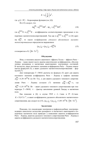 Выводы. Показано, что локализация электронов в узких графеновых нанолентах вследствие совместного размерного и магнитного квантования приводит к появлению квантового эффекта Риги - Ледюка и квантов коэффициентов Риги - Ледюка, удельного теплового сопротивления Риги - Ледюка и коэффициента удельного абсолютного магнитотеплосопротивления.