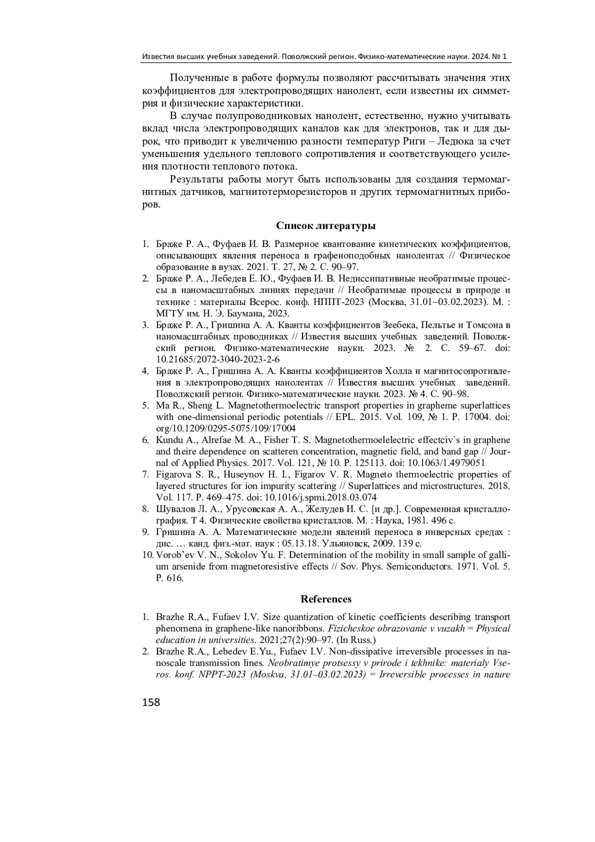 1. Браже Р. А., Фуфаев И. В. Размерное квантование кинетических коэффициентов, описывающих явления переноса в графеноподобных нанолентах // Физическое образование в вузах. 2021. Т. 27, № 2. С. 90-97. EDN: YOEEAE