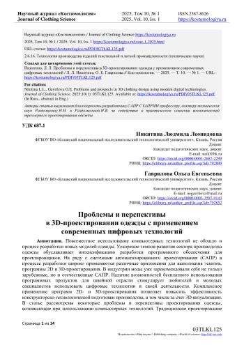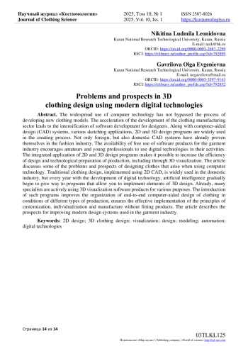 Повсеместное использование компьютерных технологий не обошло и процесс разработки новых моделей одежды. Ускорение темпов развития сектора производства одежды обуславливает интенсификацию разработки программного обеспечения для проектировщиков. На ряду с системами автоматизированного проектирования (САПР) в процессе разработки широко применяются различные приложения для выполнения эскизов, программы 2D и 3D-проектирования. В индустрии моды уже зарекомендовали себя не только зарубежные, но и отечественные САПР. Наличие возможностей бесплатного использования программных продуктов для швейной отрасли стимулирует любителей и молодых специалистов использовать цифровые технологии в своей деятельности. Комплексное применение программ 2D- и 3D-проектирования позволяет повысить эффективность конструкторско-технологической подготовки производства, в том числе за счет 3D-визуализации. В статье рассмотрены некоторые проблемы и перспективы проектирования одежды, возникающие при использовании компьютерных технологий. Традиционное проектирование одежды, реализуемое с применением 2D-САПР, широко используется в отечественной промышленности, но с каждым годом с развитием цифровых технологий, искусственного интеллекта постепенно начинают уступать место программам, позволяющим реализовывать элементы 3D-проектирования. Уже сейчас многими специалистами активно используются программные продукты 3D-визуализации для различных целей. Внедрение таких программ совершенствует организацию сквозного автоматизированного проектирования одежды в условиях разных типов производств, обеспечивает эффективную реализацию принципов кастомизации, индивидуализации и беспримерочного изготовления изделий. В статье описаны перспективы совершенствования современных систем проектирования, применяемых в швейной отрасли.