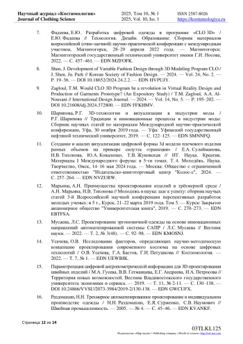 9. Zagloul, T.M. Would CLO 3D Program be a revolution in Virtual Reality Design and Production of Garments Prototype? (An Expository Study) / T.M. Zagloul, A.A. Al-Nousani // International Design Journal. - 2024. - Vol. 14, No. 5. - P. 195-202. DOI: 10.21608/idj.2024.372800 EDN: FFKHMV