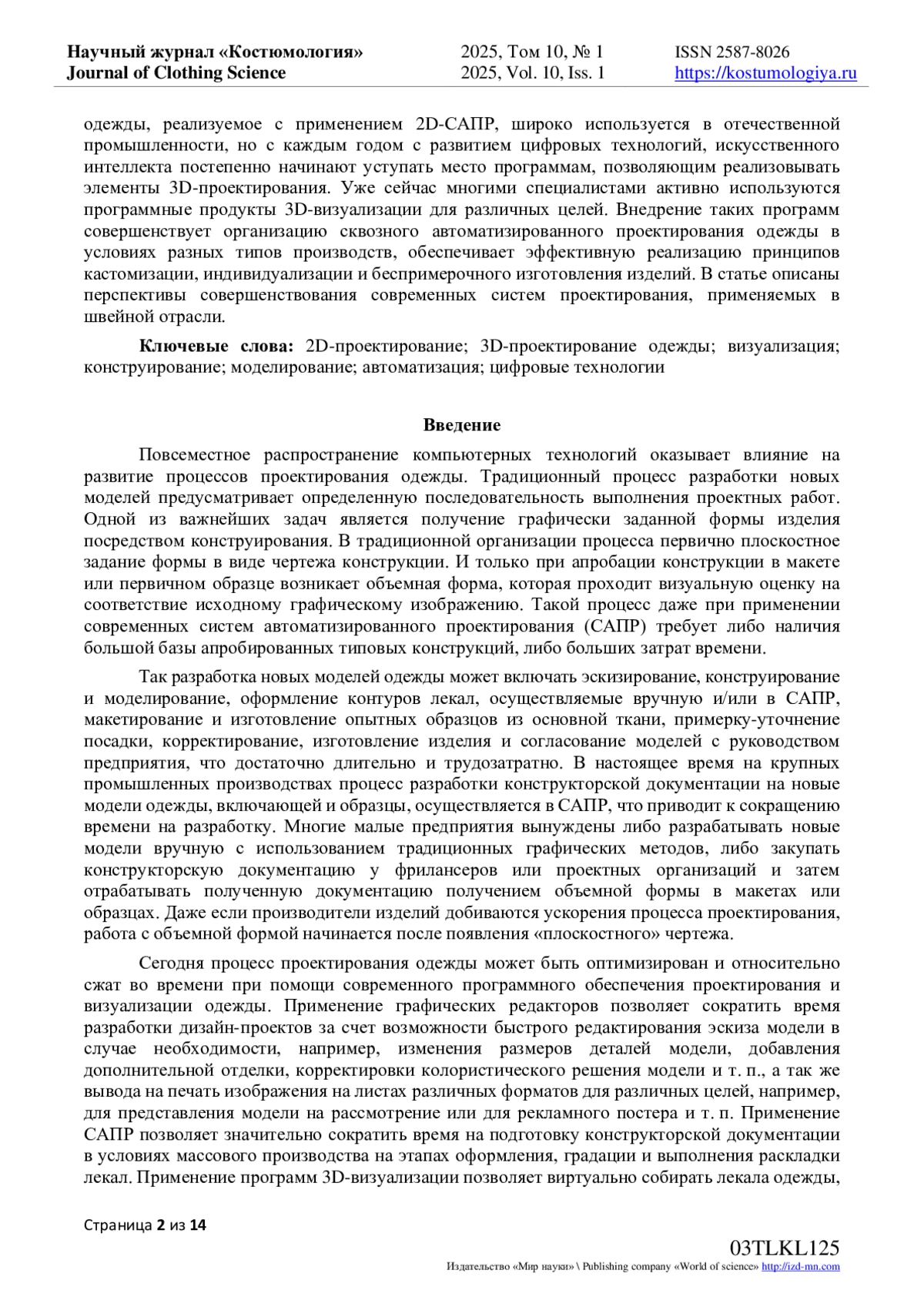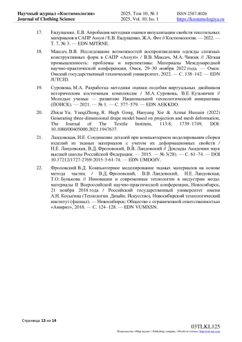 17. Евдущенко, Е.В. Апробация методики оценки визуализации свойств текстильных материалов в САПР Assyst / Е.В. Евдущенко, Ж.А. Фот // Костюмология. - 2022. - Т. 7, № 3. EDN: MJTRNE