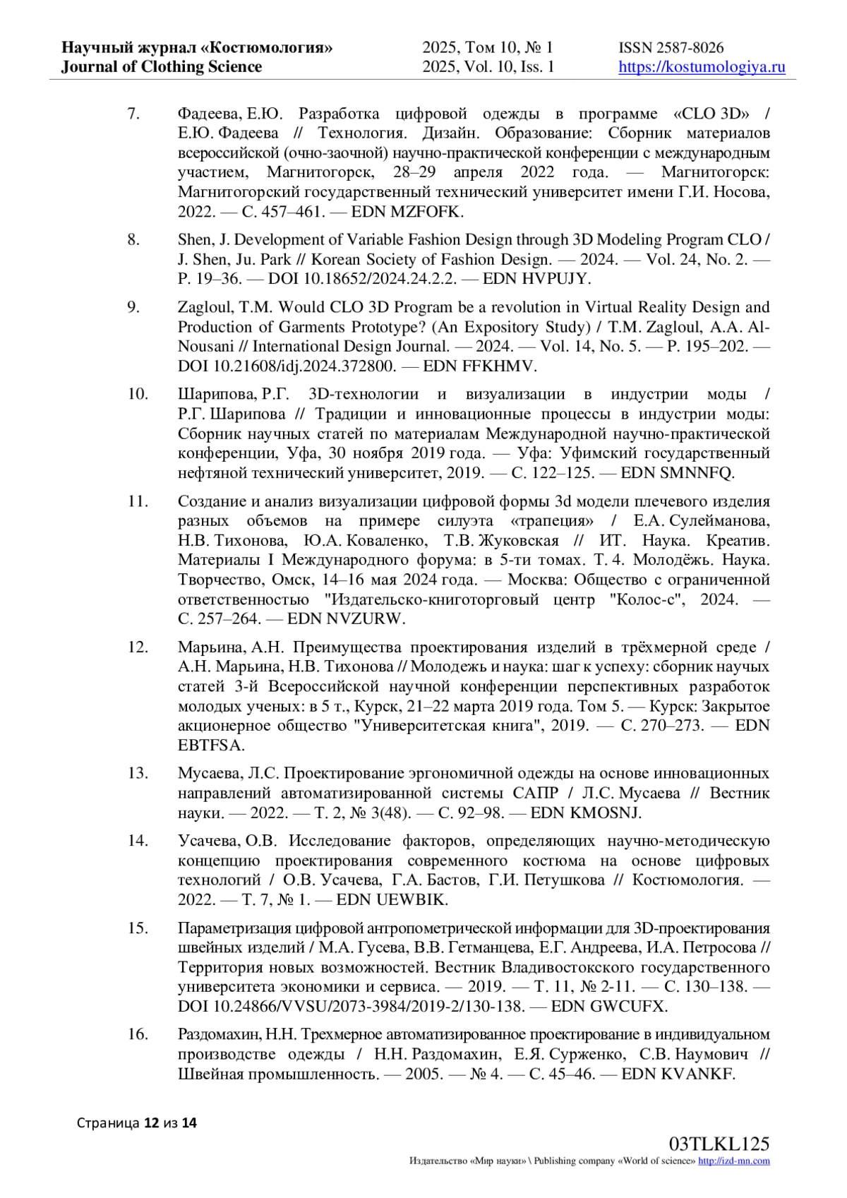 13. Мусаева, Л.С. Проектирование эргономичной одежды на основе инновационных направлений автоматизированной системы CAПР / Л.С. Мусаева // Вестник науки. - 2022. - Т. 2, № 3(48). - С. 92-98. EDN: KMOSNJ