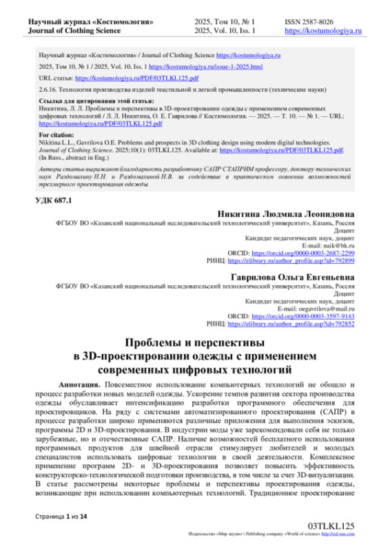 3. Калинина, Л.Н. 3D технологии в проектировании одежды / Л.Н. Калинина // Новации в процессах проектирования и производства изделий легкой промышленности: Материалы I Всероссийской научной конференции с международным участием, Казань, 25-28 апреля 2023 года. - Казань: Казанский национальный исследовательский технологический университет, 2023. - С. 96-100. EDN: IPPTCJ