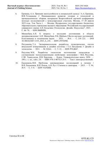 6. Еремина, А.А. Принцип многослойности в специальной одежде / А.А. Еремина, В.В. Гетманцева // Инновационное развитие техники и технологий в промышленности: сборник материалов Всероссийской научной конференции молодых исследователей с международным участием, Москва, 17-20 апреля 2023 года. Том Часть 1. - Москва: Федеральное государственное бюджетное образовательное учреждение высшего образования “Российский государственный университет имени А.Н. Косыгина (Технологии. Дизайн. Искусство)”, 2023. - С. 66-70. EDN: IMHNPR