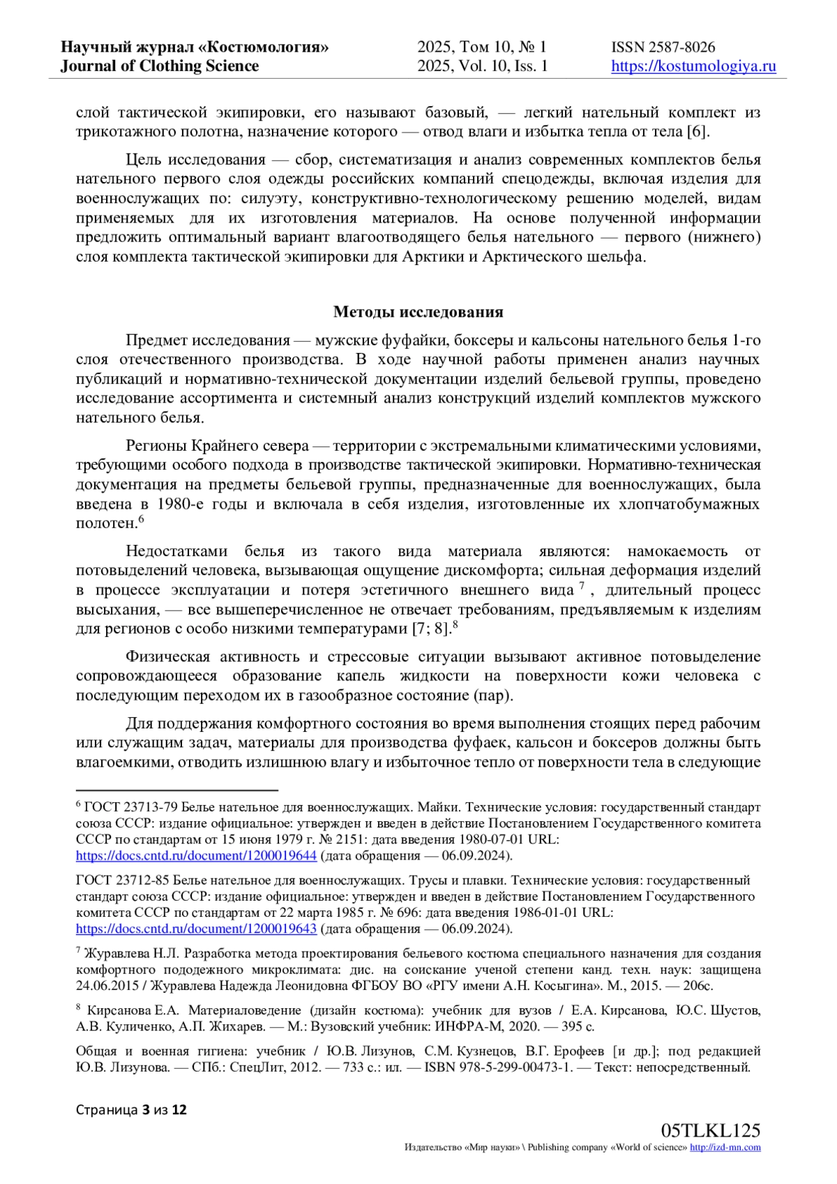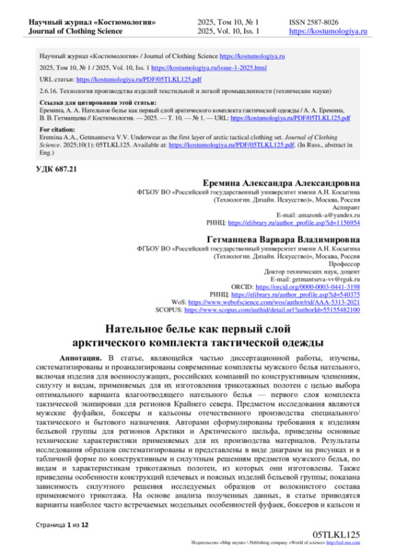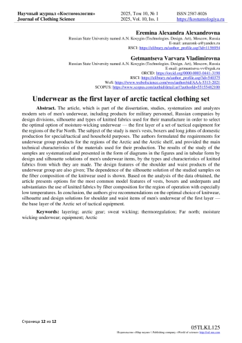 В статье, являющейся частью диссертационной работы, изучены, систематизированы и проанализированы современные комплекты мужского белья нательного, включая изделия для военнослужащих, российских компаний по конструктивным членениям, силуэту и видам, применяемых для их изготовления трикотажных полотен с целью выбора оптимального варианта влагоотводящего нательного белья - первого слоя комплекта тактической экипировки для регионов Крайнего севера. Предметом исследования являются мужские фуфайки, боксеры и кальсоны отечественного производства специального/ тактического и бытового назначения. Авторами сформулированы требования к изделиям бельевой группы для регионов Арктики и Арктического шельфа, приведены основные технические характеристики применяемых для их производства материалов. Результаты исследования образцов систематизированы и представлены в виде диаграмм на рисунках и в табличной форме по конструктивным и силуэтным решениям предметов мужского белья, по видам и характеристикам трикотажных полотен, из которых они изготовлены. Также приведены особенности конструкций плечевых и поясных изделий бельевой группы; показана зависимость силуэтного решения исследуемых образцов от волокнистого состава применяемого трикотажа. На основе анализа полученных данных, в статье приводятся варианты наиболее часто встречаемых модельных особенностей фуфаек, боксеров и кальсон и обосновано применение трикотажных полотен по волокнистому составу для региона эксплуатации с особо низкими температурами. В заключении авторами даны рекомендации по оптимальному выбору трикотажа, силуэту и конструктивным решениям плечевых и поясных предметов мужского белья первого слоя - базового слоя арктического комплекта тактической экипировки.
