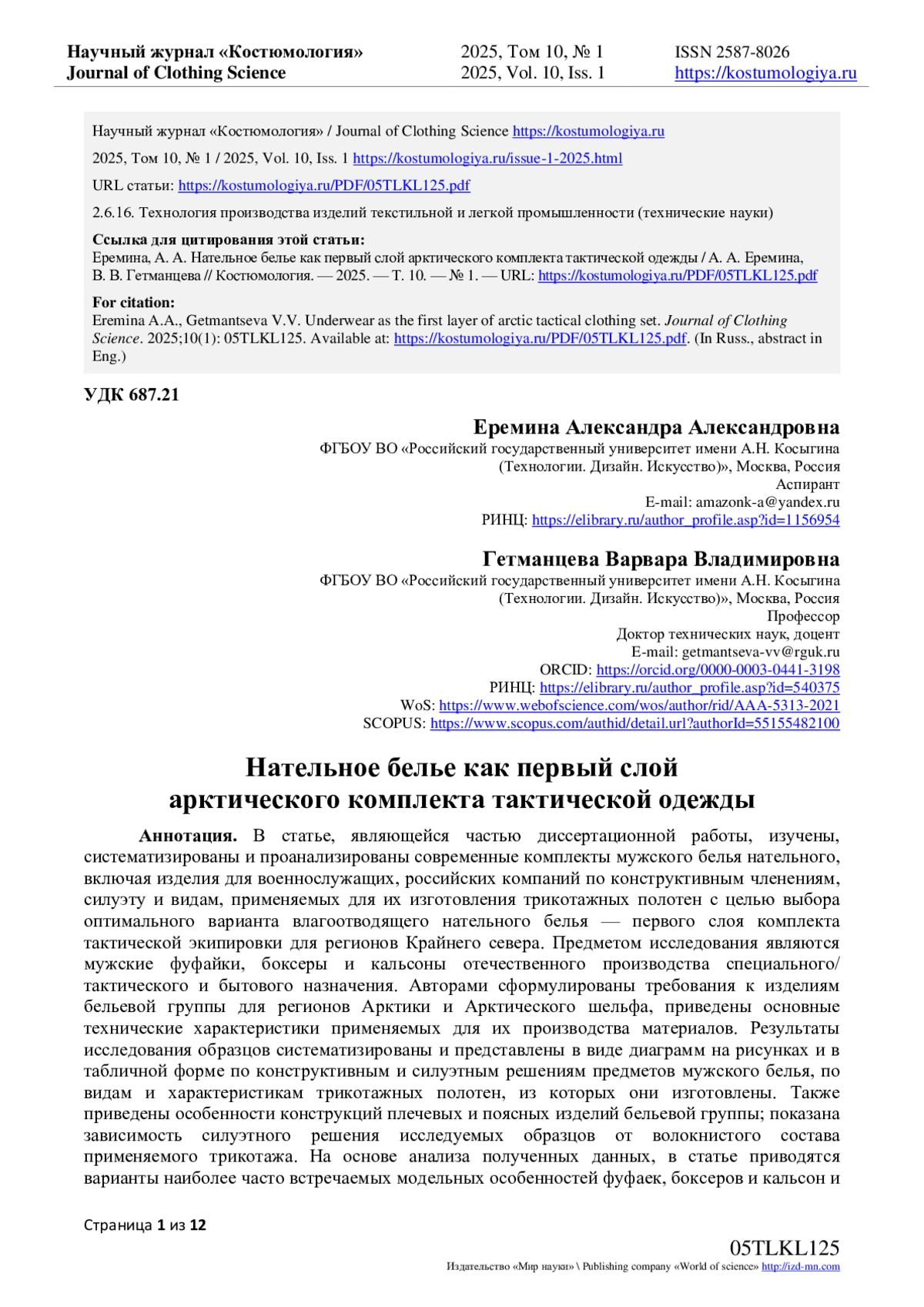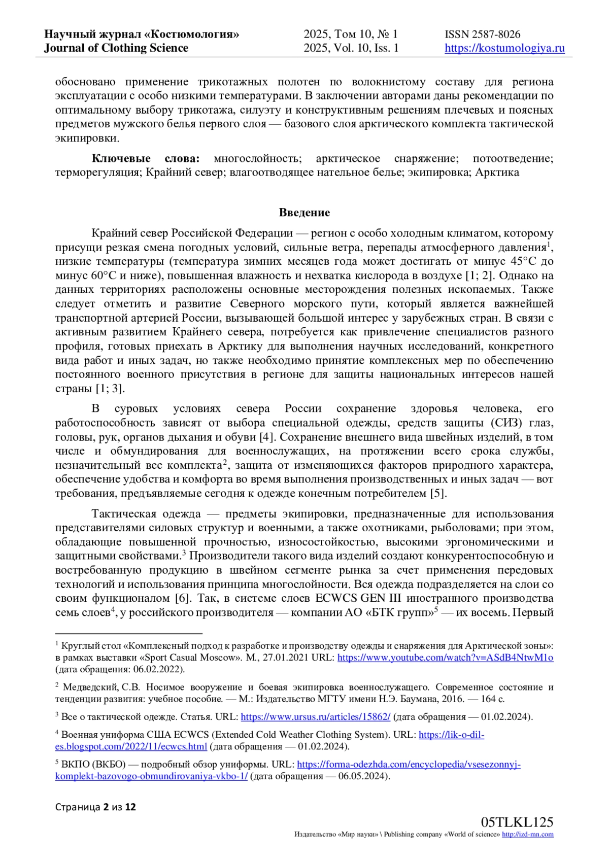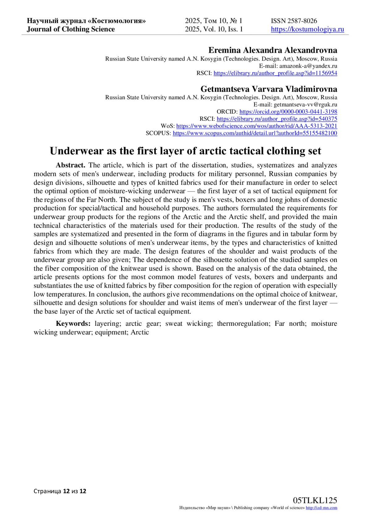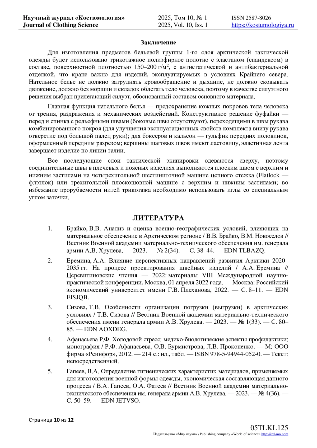 2. Еремина, А.А. Влияние перспективных направлений развития Арктики 2020-2035 гг. На процесс проектирования швейных изделий / А.А. Еремина // Церевитиновские чтения - 2022: материалы VIII Международной научно-практической конференции, Москва, 01 апреля 2022 года. - Москва: Российский экономический университет имени Г.В. Плеханова, 2022. - С. 8-11. EDN: EISJQB