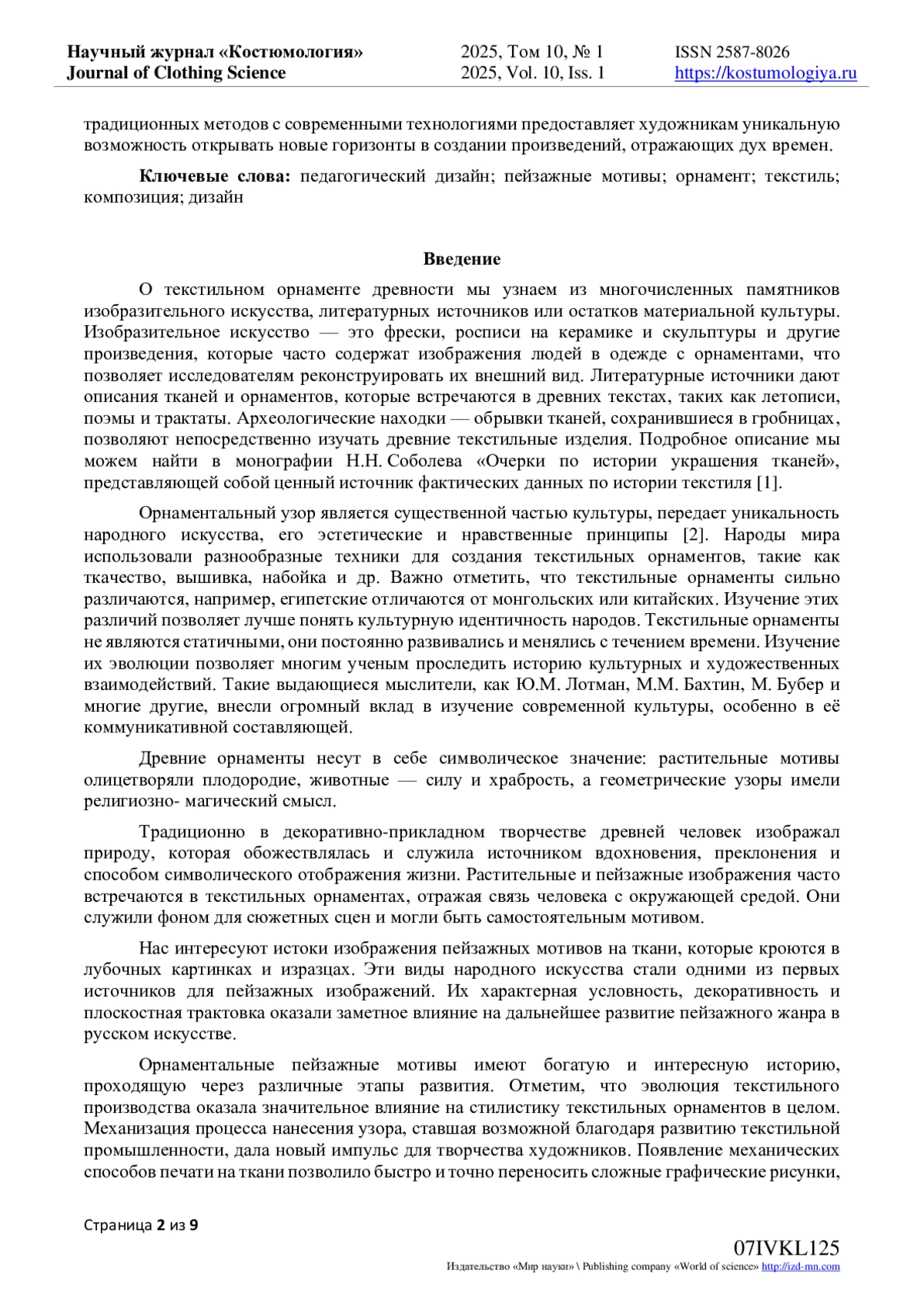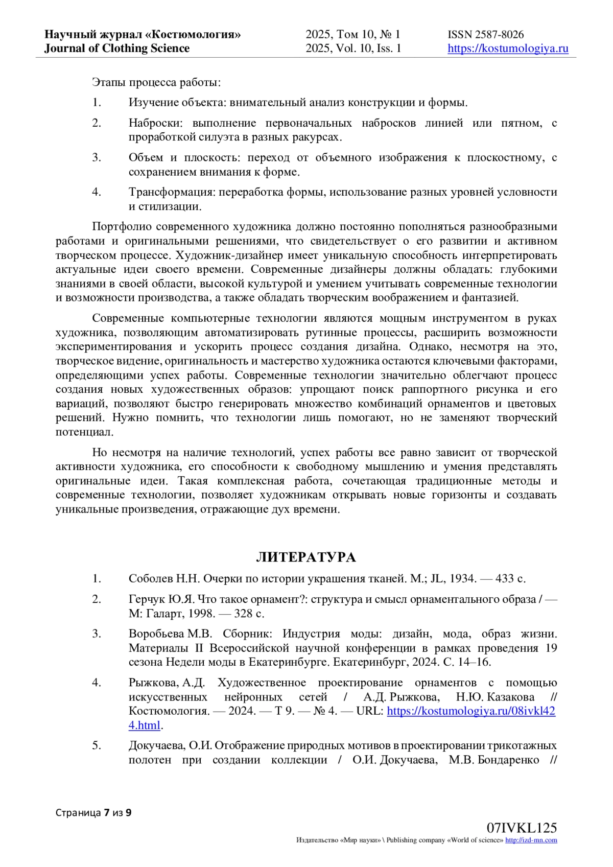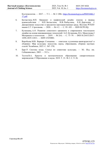 7. Кузнецова, А.О. Развитие сюжетного орнамента в современном текстильном дизайне на основе инновационных технологий / А.О. Кузнецова, Н.А. Мальгунова // Материалы и технологии. - 2019. - № 2(4). - С. 73-79. DOI: 10.24411/2617-149X-2019-12011 EDN: UXTJHO