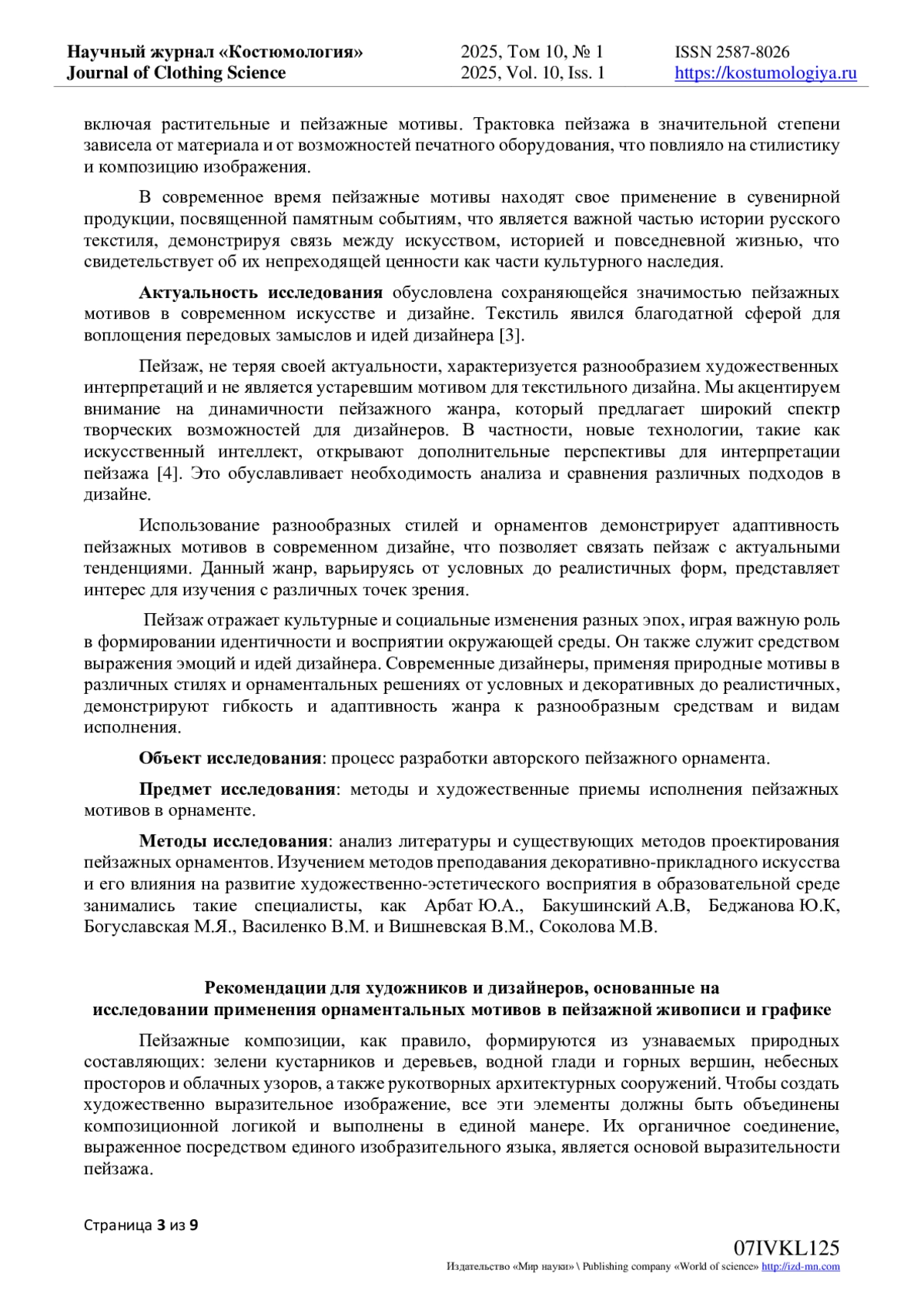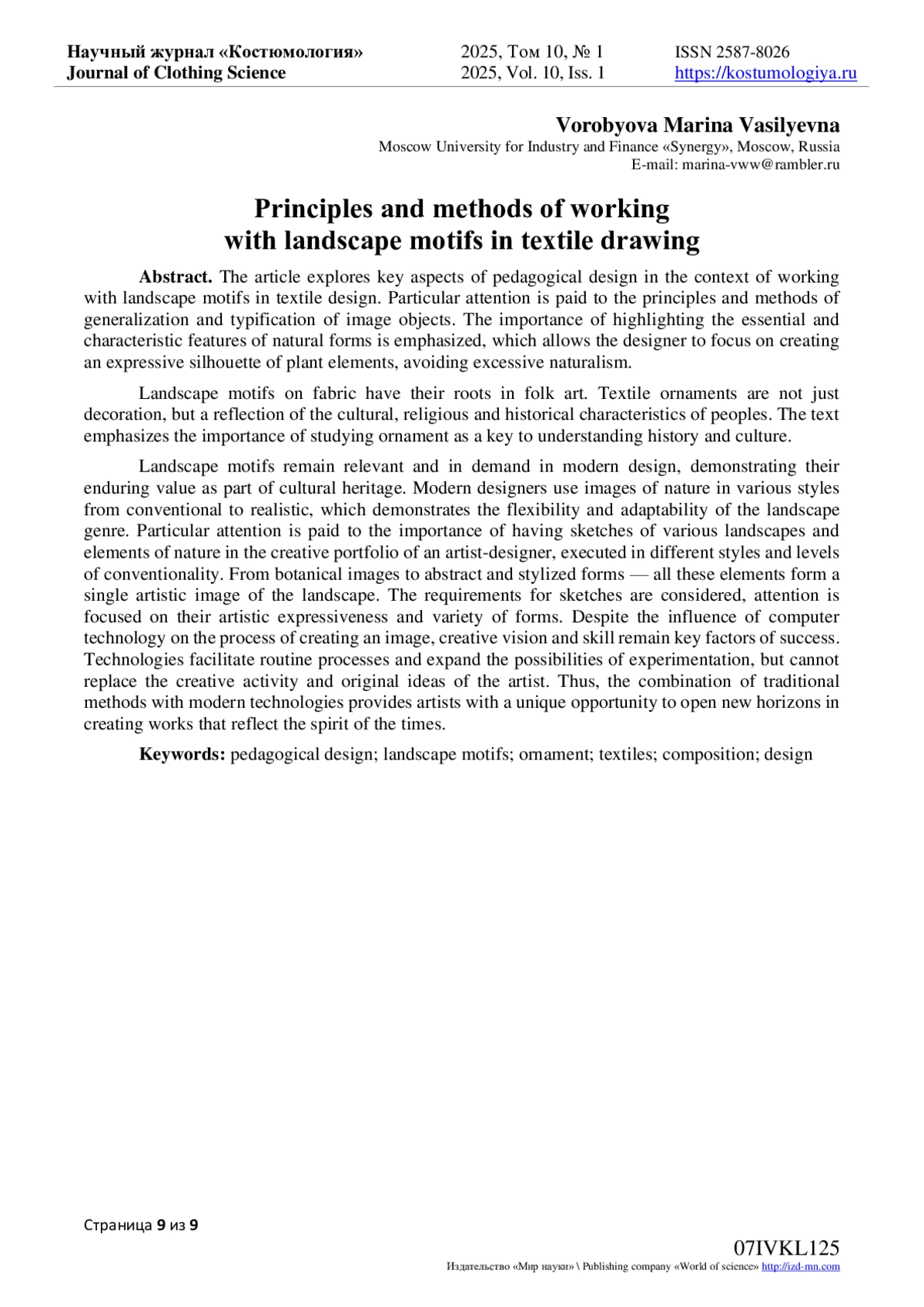 3. Воробьева М.В. Сборник: Индустрия моды: дизайн, мода, образ жизни. Материалы II Всероссийской научной конференции в рамках проведения 19 сезона Недели моды в Екатеринбурге. Екатеринбург, 2024. С. 14-16.