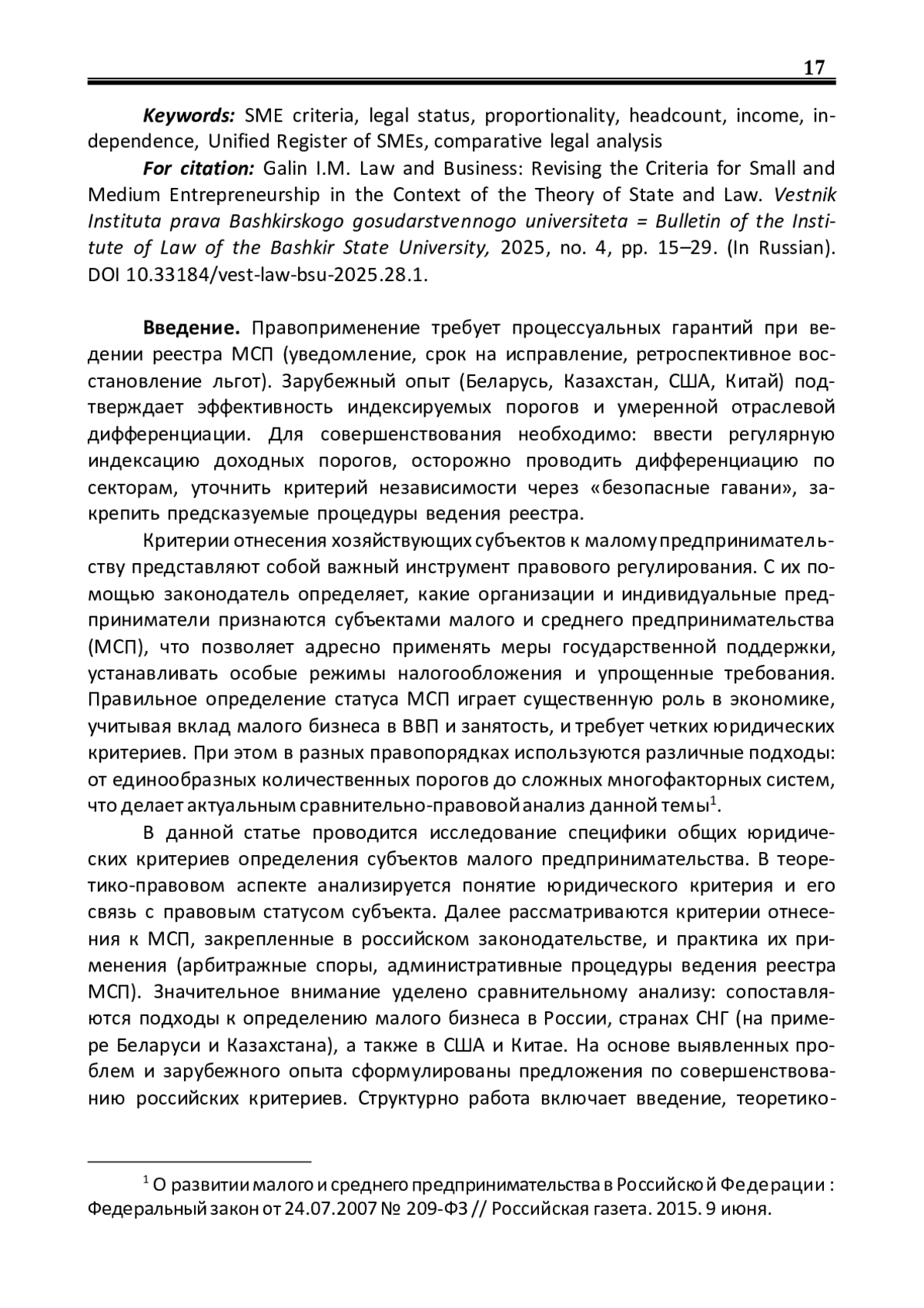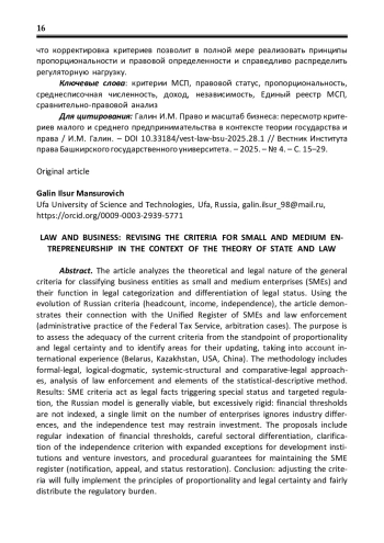 Статья анализирует теоретико-правовую природу общих критериев отнесения хозяйствующих субъектов к малому и среднему предпринимательству (МСП) и их функцию юридической категоризации и дифференциации правового статуса. На материале эволюции российских критериев (среднесписочная численность, доход, независимость) показана их связь с Единым реестром субъектов МСП и правоприменением (административная практика ФНС, арбитражные дела). Цель – оценить адекватность действующих критериев с позиций пропорциональности и правовой определенности и определить направления их обновления с учетом зарубежного опыта (Беларусь, Казахстан, США, Китай). Методология включает формально-юридический, логикодогматический, системно-структурный и сравнительно-правовой подходы, анализ правоприменения и элементы статистико-описательного метода. Результаты: критерии МСП выступают юридическими фактами, запускающими специальный статус и адресное регулирование; российская модель в целом работоспособна, но избыточно жестка: финансовые пороги не индексируются, единый лимит по численности игнорирует отраслевые различия, а тест на независимость может сдерживать инвестиции. Предлагаются регулярная индексация финансовых порогов, аккуратная отраслевая дифференциация, уточнение критериев независимости с расширением исключений для институтов развития и венчурных инвесторов, а также процессуальные гарантии при ведении реестра МСП (уведомление, обжалование, восстановление статуса). Делается вывод что корректировка критериев позволит в полной мере реализовать принципы пропорциональности и правовой определенности и справедливо распределить регуляторную нагрузку.