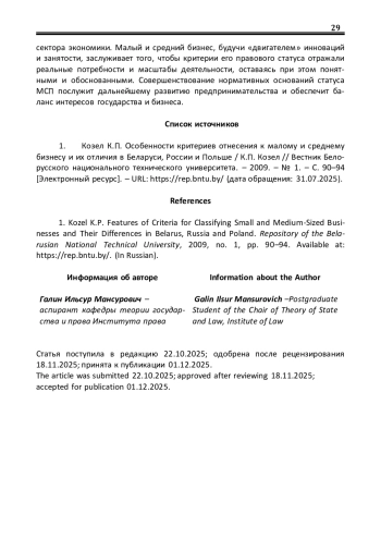 1. Козел К.П. Особенности критериев отнесения к малому и среднему бизнесу и их отличия в Беларуси, России и Польше / К.П. Козел // Вестник Белорусского национального технического университета. - 2009. - № 1. - С. 90-94 [Электронный ресурс]. - URL: https://rep.bntu.by/(дата обращения: 31.07.2025). EDN: VWXKWL
