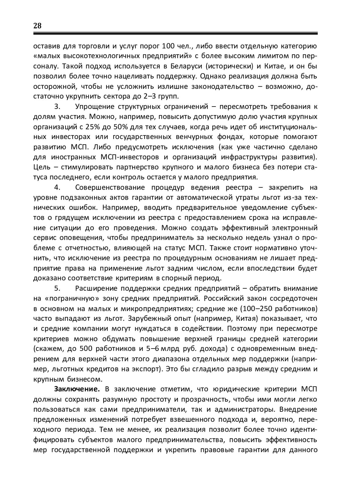 Введение. Правоприменение требует процессуальных гарантий при ведении реестра МСП (уведомление, срок на исправление, ретроспективное восстановление льгот). Зарубежный опыт (Беларусь, Казахстан, США, Китай) подтверждает эффективность индексируемых порогов и умеренной отраслевой дифференциации. Для совершенствования необходимо: ввести регулярную индексацию доходных порогов, осторожно проводить дифференциацию по секторам, уточнить критерий независимости через «безопасные гавани», закрепить предсказуемые процедуры ведения реестра