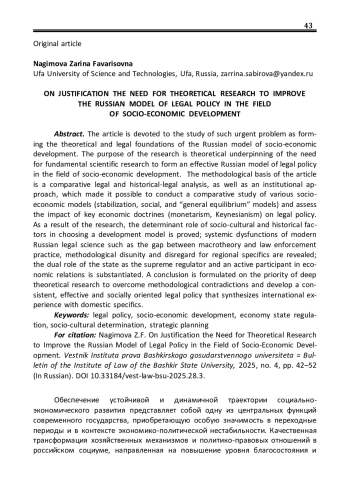 Статья посвящена исследованию актуальной проблемы формирования теоретико-правовых основ российской модели социальноэкономического развития. Целью исследования, представленного в настоящей статье, является теоретическое обоснование необходимости фундаментальных научных изысканий для формирования эффективной российской модели правовой политики в сфере социально-экономического развития. Методологическую основу статьи составили сравнительно-правовой и историко-правовой анализ, а также институциональный подход, позволившие провести сравнительное исследование различных социально-экономических моделей (стабилизационной, социальной, модели «всеобщего равновесия») и оценить влияние ключевых экономических доктрин (монетаризм, кейнсианство) на правовую политику. В результате проведенного исследования доказана детерминирующая роль социокультурных и исторических факторов при выборе модели развития; выявлены системные дисфункции современной российской правовой науки, такие как разрыв между макротеорией и правоприменительной практикой, методологическая разобщенность и игнорирование региональной специфики; обоснована двойственная роль государства как верховного регулятора и активного участника экономических отношений. Сформулирован вывод о приоритетности глубоких теоретических исследований для преодоления методологических противоречий и выработки последовательной, эффективной и социально-ориентированной правовой политики, синтезирующей международный опыт с отечественной спецификой