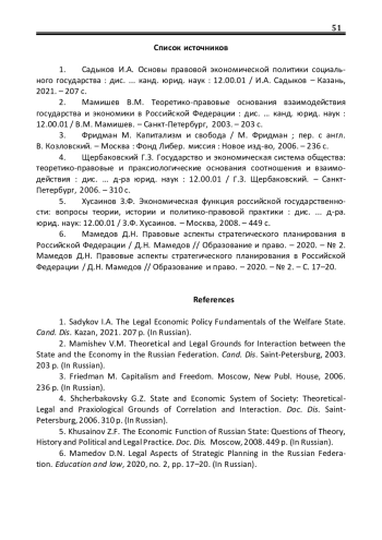 1. Садыков И.А. Основы правовой экономической политики социального государства: дис.. канд. юрид. наук: 12.00.01 / И.А. Садыков - Казань, 2021. - 207 с. EDN: GDEYBQ