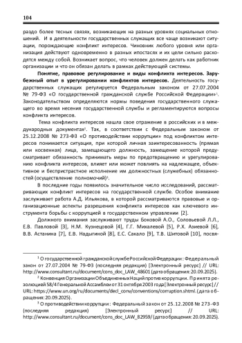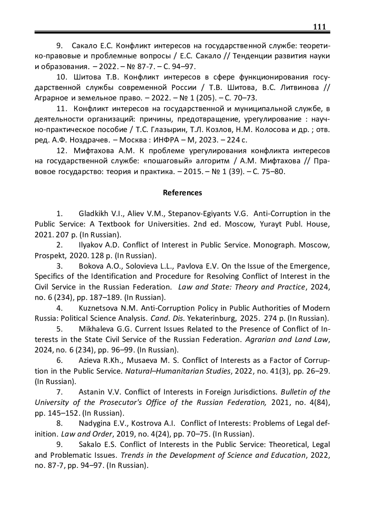 9. Сакало Е.С. Конфликт интересов на государственной службе: теоретико-правовые и проблемные вопросы / Е.С. Сакало // Тенденции развития науки и образования. - 2022. - № 87-7. - С. 94-97. EDN: OWZBZK