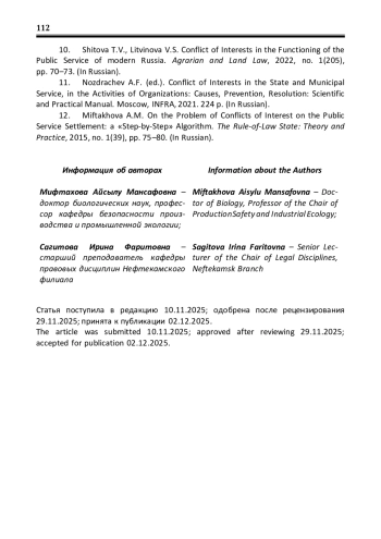 10. Шитова Т.В. Конфликт интересов в сфере функционирования государственной службы современной России / Т.В. Шитова, В.С. Литвинова // Аграрное и земельное право. - 2022. - № 1 (205). - С. 70-73. EDN: BAKPJJ