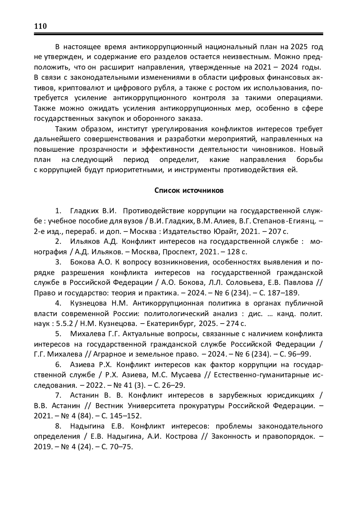 1. Гладких В.И. Противодействие коррупции на государственной службе: учебное пособие для вузов / В.И. Гладких, В.М. Алиев, В.Г. Степанов-Егиянц. - 2-е изд., перераб. и доп. - Москва: Издательство Юрайт, 2021. - 207 с. EDN: SGNTGS