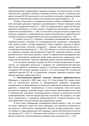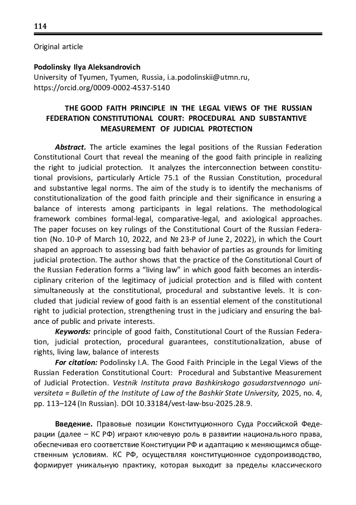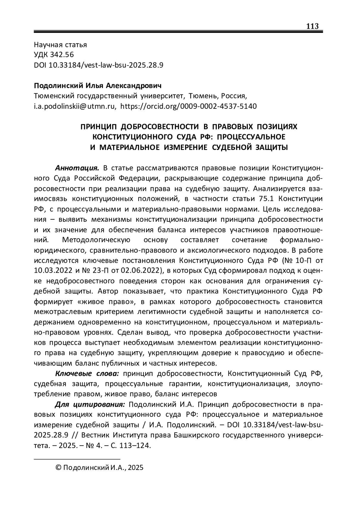 В статье рассматриваются правовые позиции Конституционного Суда Российской Федерации, раскрывающие содержание принципа добросовестности при реализации права на судебную защиту. Анализируется взаимосвязь конституционных положений, в частности статьи 75.1 Конституции РФ, с процессуальными и материально-правовыми нормами. Цель исследования – выявить механизмы конституционализации принципа добросовестности и их значение для обеспечения баланса интересов участников правоотношений. Методологическую основу составляет сочетание формальноюридического, сравнительно-правового и аксиологического подходов. В работе исследуются ключевые постановления Конституционного Суда РФ (No 10-П от 10.03.2022 и No 23-П от 02.06.2022), в которых Суд сформировал подход к оценке недобросовестного поведения сторон как основания для ограничения судебной защиты. Автор показывает, что практика Конституционного Суда РФ формирует «живое право», в рамках которого добросовестность становится межотраслевым критерием легитимности судебной защиты и наполняется содержанием одновременно на конституционном, процессуальном и материально-правовом уровнях. Сделан вывод, что проверка добросовестности участников процесса выступает необходимым элементом реализации конституционного права на судебную защиту, укрепляющим доверие к правосудию и обеспечивающим баланс публичных и частных интересов