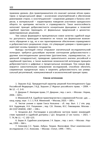 1. Зорькин В.Д. Прецедентный характер решений Конституционного Суда Российской Федерации / В.Д. Зорькин // Журнал российского права. - 2004. - № 12. - С. 3-9.