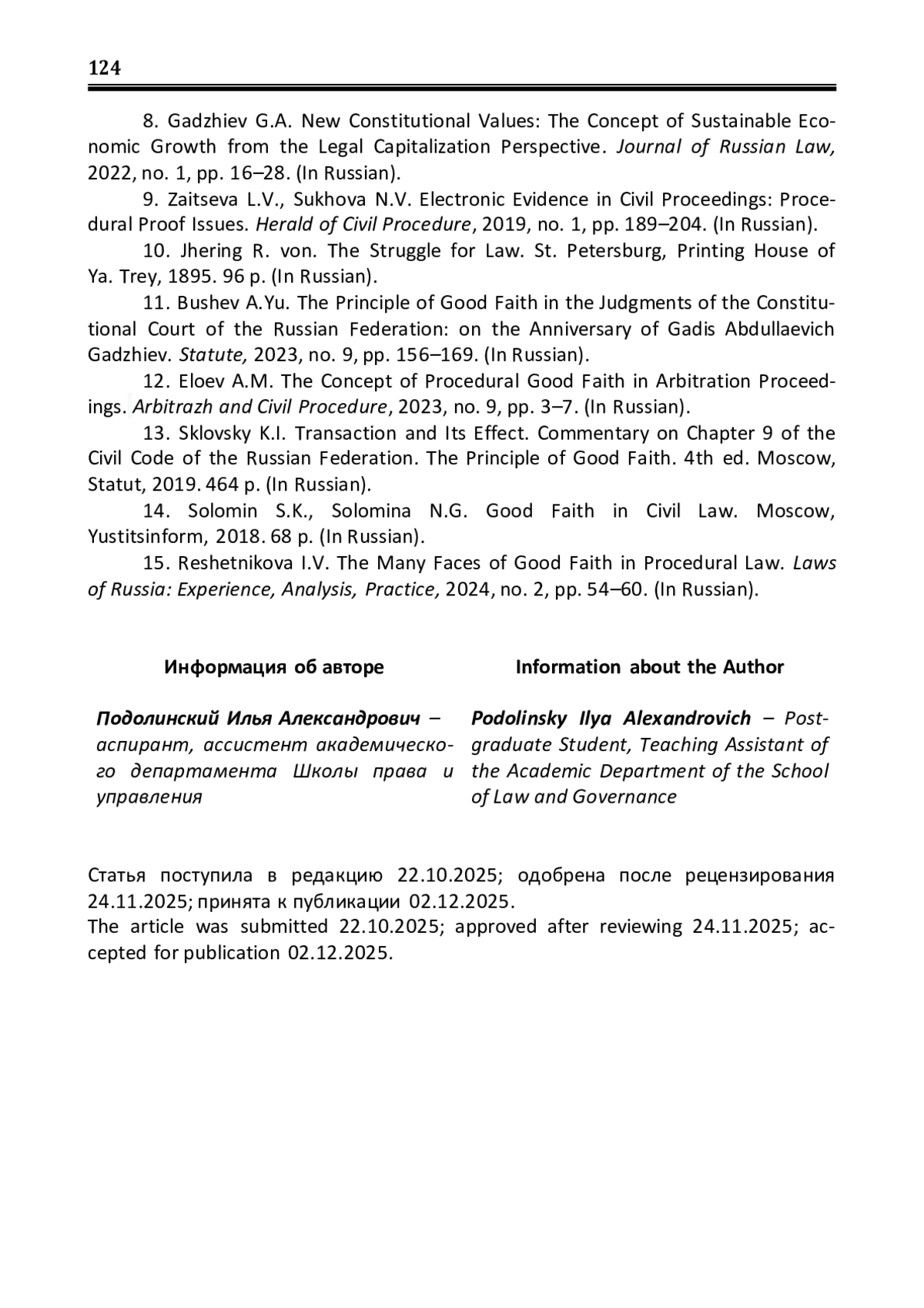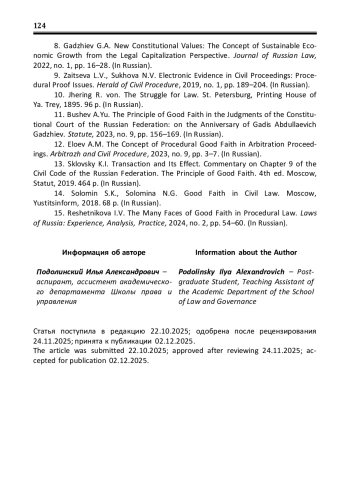 12. Елоев А.М. Понятие процессуальной добросовестности в арбитражном судопроизводстве / А.М. Елоев // Арбитражный и гражданский процесс. - 2023. - № 9. - С. 3-7. EDN: EVKKSV