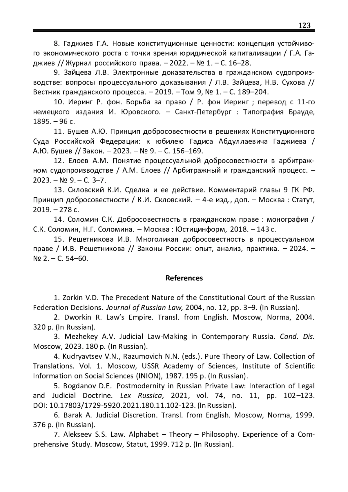 15. Решетникова И.В. Многоликая добросовестность в процессуальном праве / И.В. Решетникова // Законы России: опыт, анализ, практика. - 2024. - № 2. - С. 54-60. EDN: LYAVCI