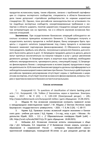 1. Kurpayanidi K.I. To questions of classification of Islamic banking products / K.I. Kurpayanidi, I.Sh. Tolibov // Бюллетень науки и практики. Электрон. журн. - 2017. - № 9 (22). - С. 120-130 [Электронный ресурс]. - URL: http://www.bulletennauki.com/kurpayanidi-tolibov (дата обращения: 15.08.2025).
