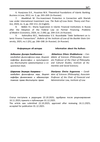 9. Калимуллина М.Э. Круглый стол “Урегулирование долга по сделкам исламского финансирования” / М.Э. Калимуллина, В.В. Недорезков // Вестник Института права Башкирского государственного университета. - 2025. - № 1 (25). - С. 266-268. EDN: EJQFOM