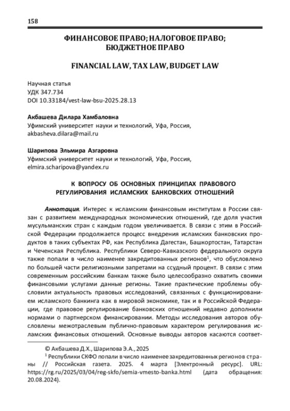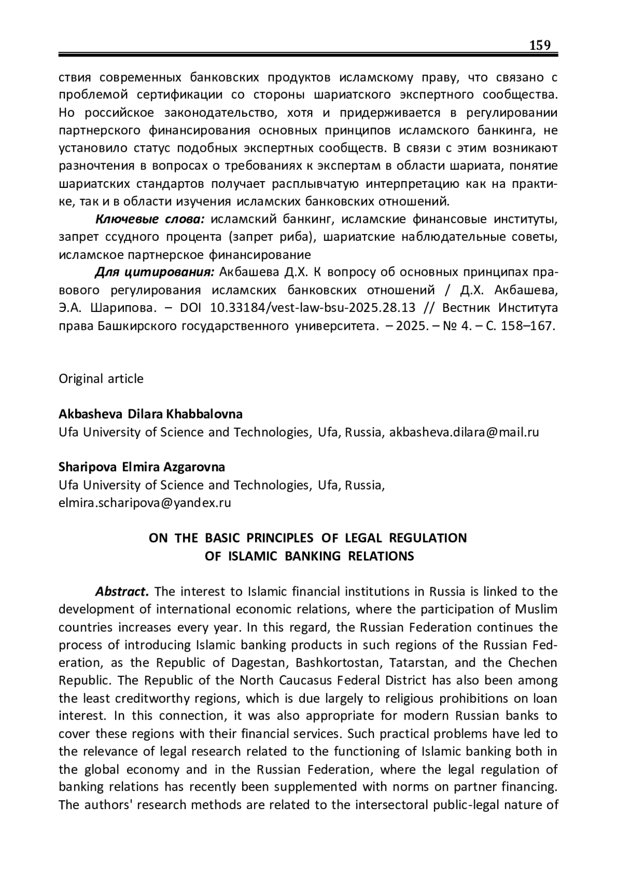 Интерес к исламским финансовым институтам в России связан с развитием международных экономических отношений, где доля участия мусульманских стран с каждым годом увеличивается. В связи с этим в Российской Федерации продолжается процесс внедрения исламских банковских продуктов в таких субъектах РФ, как Республика Дагестан, Башкортостан, Татарстан и Чеченская Республика. Республики Северо-Кавказского федерального округа также попали в число наименее закредитованных регионов12, что обусловлено по большей части религиозными запретами на ссудный процент. В связи с этим современным российским банкам также было целесообразно охватить своими финансовыми услугами данные регионы. Такие практические проблемы обусловили актуальность правовых исследований, связанных с функционированием исламского банкинга как в мировой экономике, так и в Российской Федерации, где правовое регулирование банковских отношений недавно дополнили нормами о партнерском финансировании. Методы исследования авторов обусловлены межотраслевым публично-правовым характером регулирования исламских финансовых отношений. Основные выводы авторов касаются соответствия современных банковских продуктов исламскому праву, что связано с проблемой сертификации со стороны шариатского экспертного сообщества. Но российское законодательство, хотя и придерживается в регулировании партнерского финансирования основных принципов исламского банкинга, не установило статус подобных экспертных сообществ. В связи с этим возникают разночтения в вопросах о требованиях к экспертам в области шариата, понятие шариатских стандартов получает расплывчатую интерпретацию как на практике, так и в области изучения исламских банковских отношений.