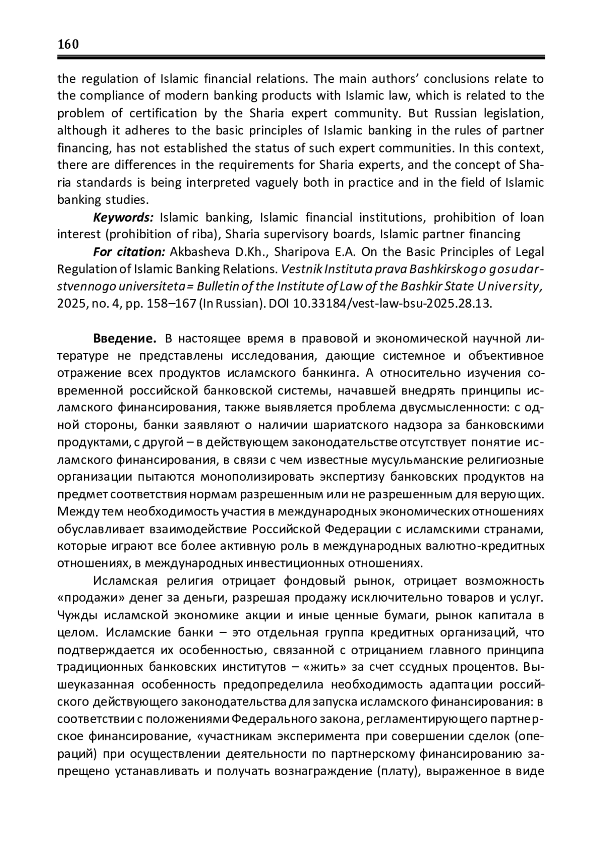 Введение. В настоящее время в правовой и экономической научной литературе не представлены исследования, дающие системное и объективное отражение всех продуктов исламского банкинга. А относительно изучения современной российской банковской системы, начавшей внедрять принципы исламского финансирования, также выявляется проблема двусмысленности: с одной стороны, банки заявляют о наличии шариатского надзора за банковскими продуктами, с другой – в действующем законодательстве отсутствует понятие исламского финансирования, в связи с чем известные мусульманские религиозные организации пытаются монополизировать экспертизу банковских продуктов на предмет соответствия нормам разрешенным или не разрешенным для верующих. Между тем необходимость участия в международных экономических отношениях обуславливает взаимодействие Российской Федерации с исламскими странами, которые играют все более активную роль в международных валютно-кредитных отношениях, в международных инвестиционных отношениях