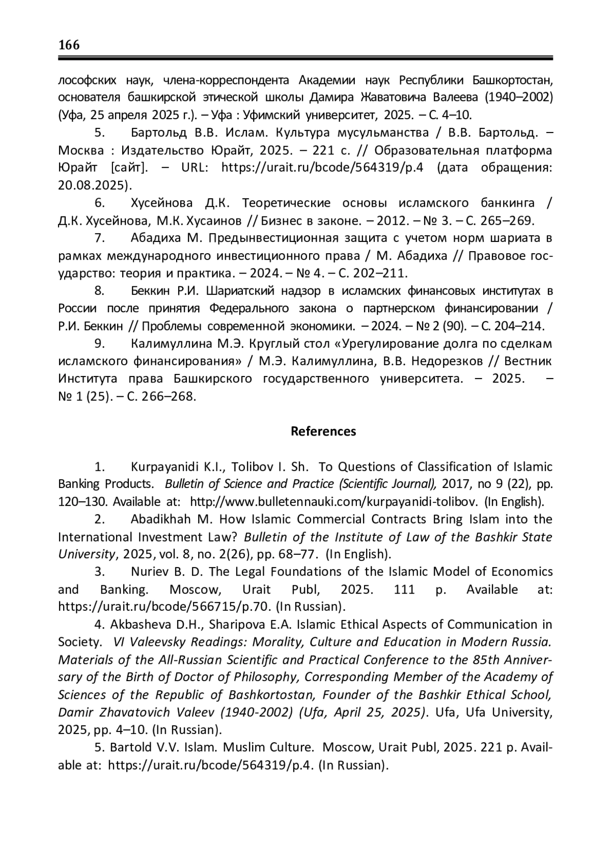 2. Абадиха М. Как исламские коммерческие контракты привносят ислам в международное инвестиционное право? / М. Абадиха // Вестник Института права Башкирского государственного университета. - 2025. - Т. 8, № 2 (26). - С. 68-77. EDN: LWDGXM
