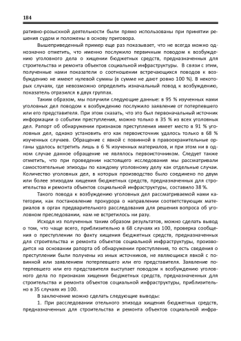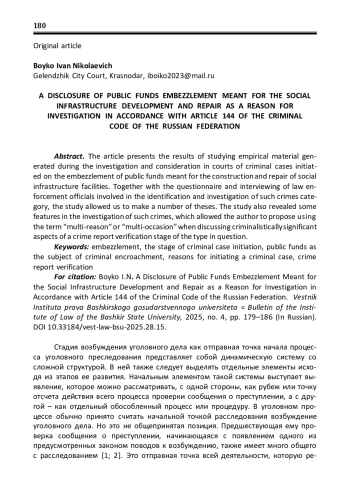 В статье представлены результаты изучения эмпирического материала, сформированного при расследовании и рассмотрении в судах уголовных дел, возбужденных по признакам хищения бюджетных средств, предназначенных для строительства и ремонта объектов социальной инфраструктуры. В совокупности с проводимым анкетированием и интервьюированием представителей правоохранительных органов, участвовавших в выявлении и расследовании преступлений указанной категории, исследование позволило сделать ряд тезисов, приводимых автором статьи. Исследование также выявило некоторые особенности в расследовании таких преступлений, что позволило автору предложить использовать термин «многоповодность» или «мультиоказность» при рассуждениях о криминалистически значимых аспектах этапа проверки сообщения о преступлении рассматриваемого вида