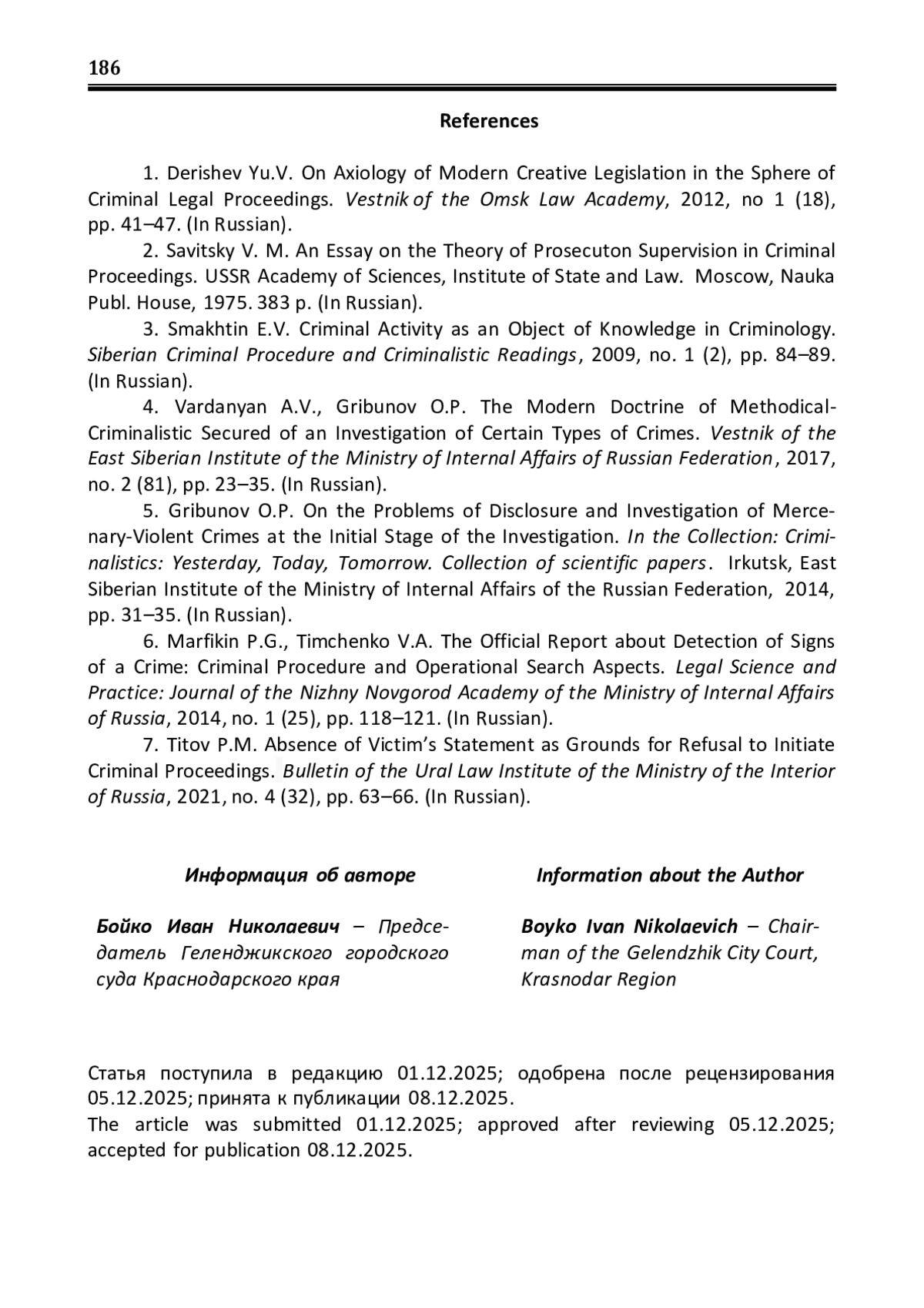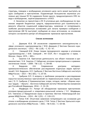 1. Деришев Ю.В. Об аксиологии современного законодательства в сфере уголовного судопроизводства / Ю.В. Деришев // Вестник Омского юридического института. - 2012. - № 1 (18). - С. 41- 47.