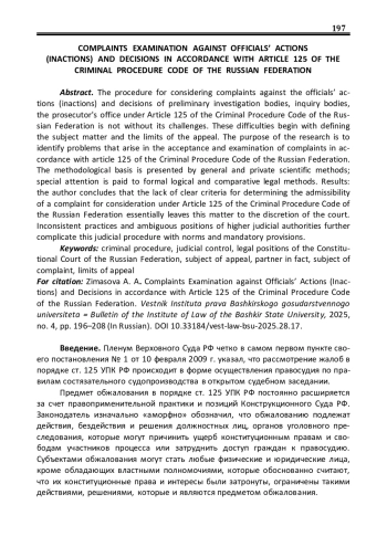 Процедура рассмотрения жалоб на действия и бездействие, решения должностных лиц органов предварительного расследования, дознания и прокуратуры в порядке статьи 125 УПК РФ не лишена проблем. Сложности начинаются с определения предмета и пределов обжалования. Цель настоящей публикации – выявить проблемы, возникающие при принятии и рассмотрении жалоб в порядке, предусмотренном статьей 125 УПК РФ. Методологическая база представлена общенаучными и частнонаучными методами, особое внимание уделяется формально-логическому и сравнительно-правовому методам. Результаты: автором сделан вывод, что отсутствие четких критериев для определения приемлемости жалобы для ее рассмотрения в порядке ст. 125 УПК РФ практически оставляет данный вопрос на усмотрение суда. Противоречивая практика и неоднозначные позиции высших судебных инстанций еще больше усложняют данную судебную процедуру нормами и обязательными для применения положениями
