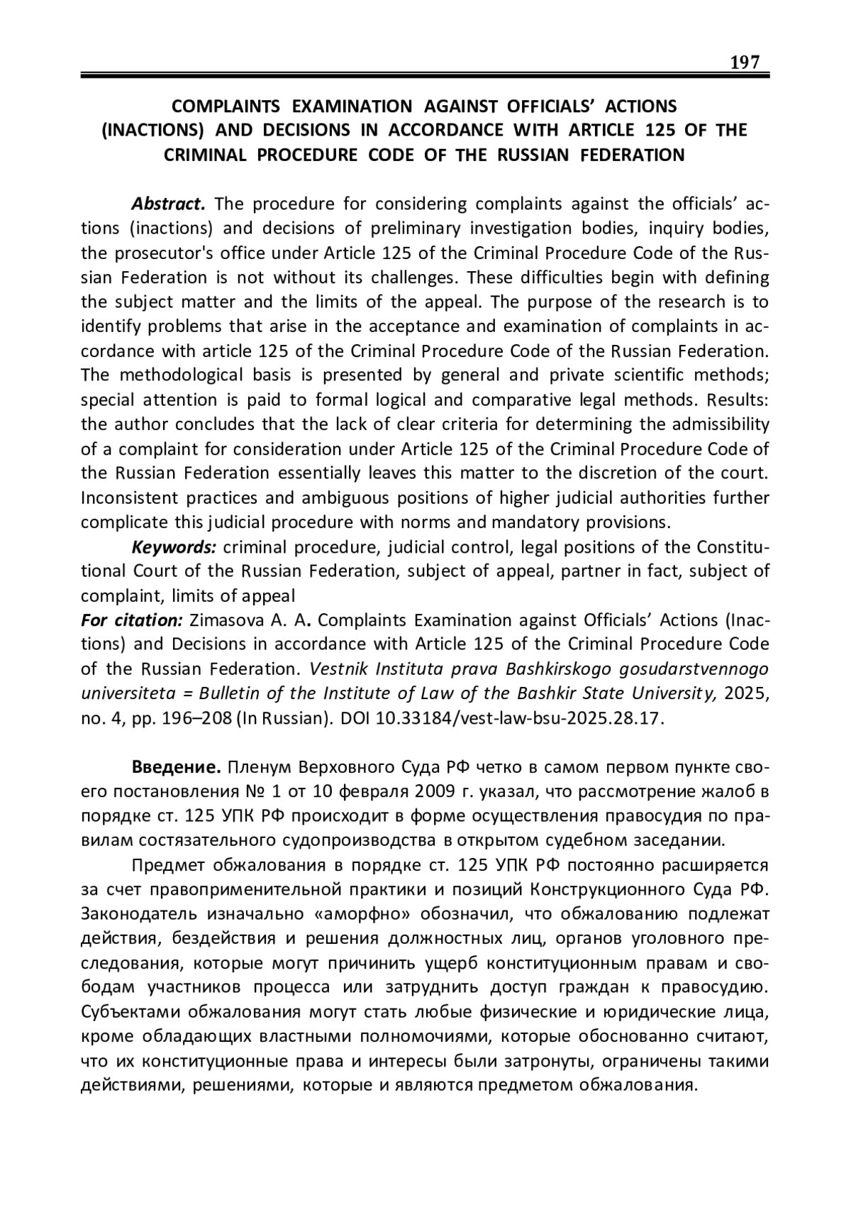 Введение. Пленум Верховного Суда РФ четко в самом первом пункте своего постановления No 1 от 10 февраля 2009 г. указал, что рассмотрение жалоб в порядке ст. 125 УПК РФ происходит в форме осуществления правосудия по правилам состязательного судопроизводства в открытом судебном заседании. Предмет обжалования в порядке ст. 125 УПК РФ постоянно расширяется за счет правоприменительной практики и позиций Конструкционного Суда РФ. Законодатель изначально «аморфно» обозначил, что обжалованию подлежат действия, бездействия и решения должностных лиц, органов уголовного преследования, которые могут причинить ущерб конституционным правам и свободам участников процесса или затруднить доступ граждан к правосудию. Субъектами обжалования могут стать любые физические и юридические лица, кроме обладающих властными полномочиями, которые обоснованно считают, что их конституционные права и интересы были затронуты, ограничены такими действиями, решениями, которые и являются предметом обжалования