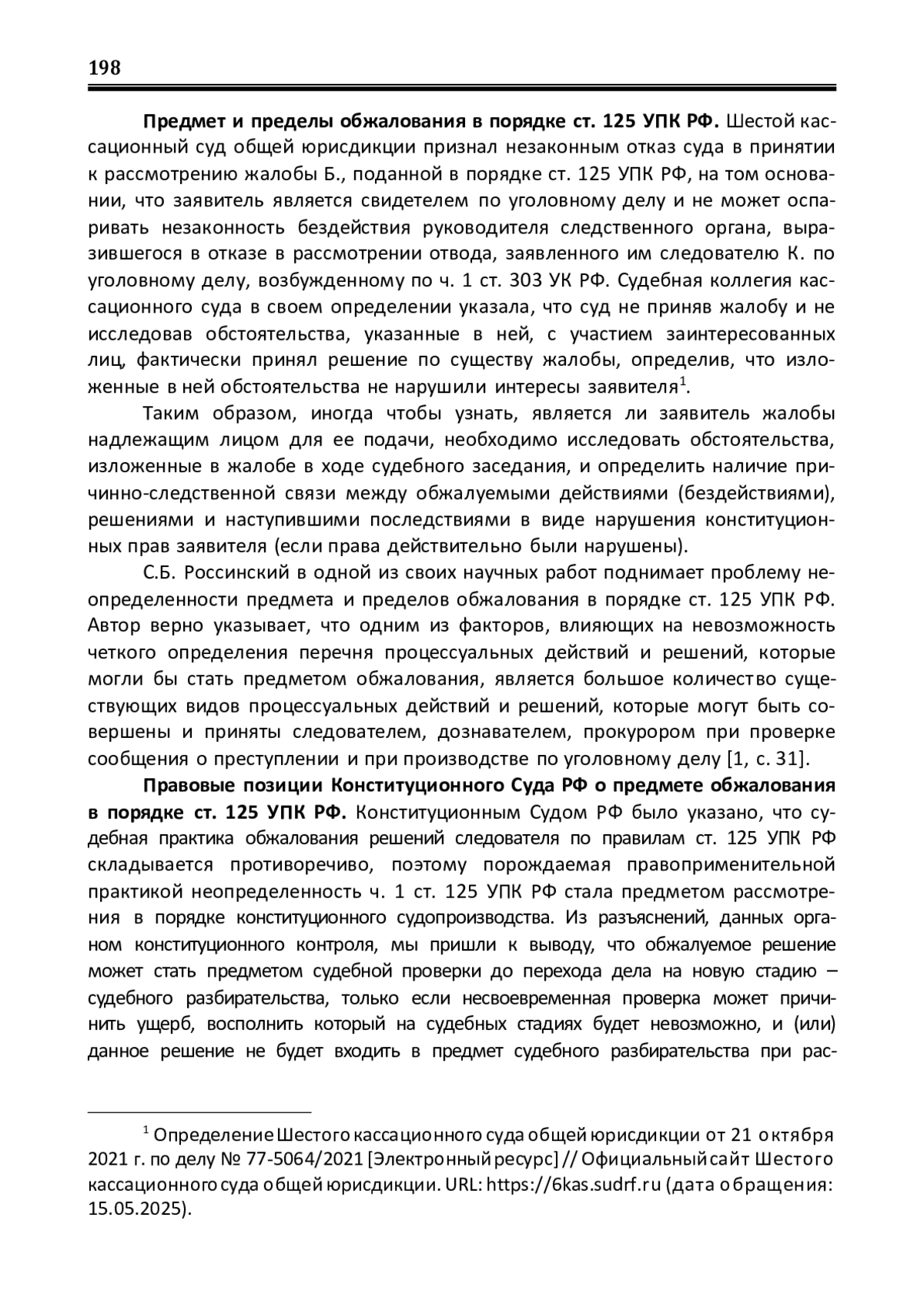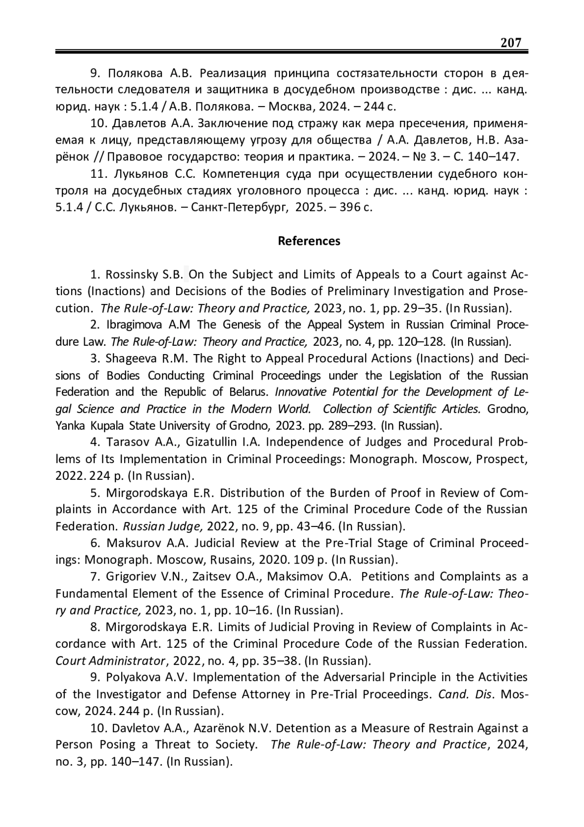 1. Россинский С.Б. О предмете и пределах обжалования в суде действий (бездействия) и решений органов предварительного расследования и прокуратуры / С.Б. Россинский // Правовое государство: теория и практика. - 2023. - № 1. - С. 29-35. EDN: ALGEFN