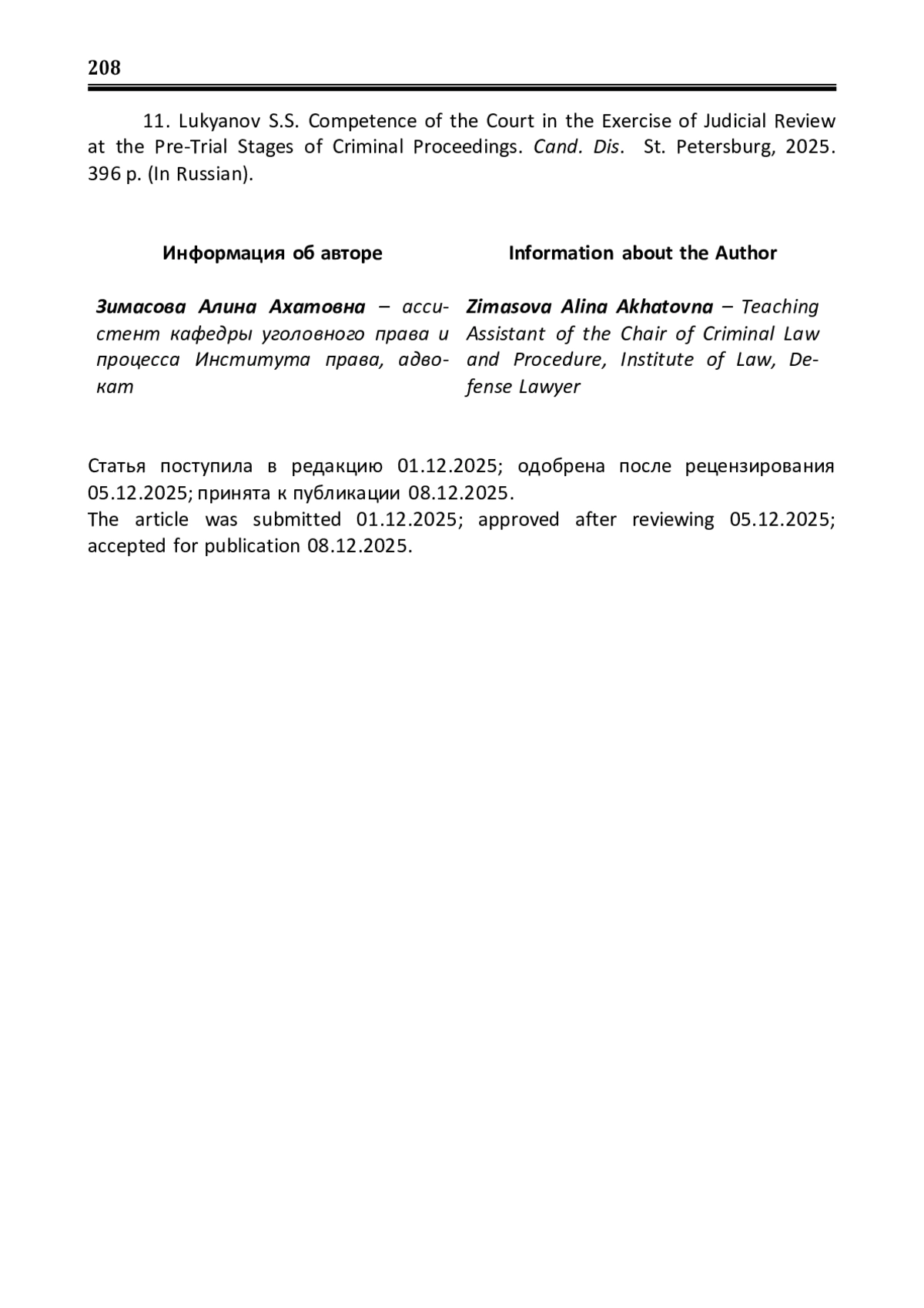 11. Лукьянов С.С. Компетенция суда при осуществлении судебного контроля на досудебных стадиях уголовного процесса: дис. канд. юрид. наук: 5.1.4 / С.С. Лукьянов. - Санкт-Петербург, 2025. - 396 с. EDN: YMBBGB