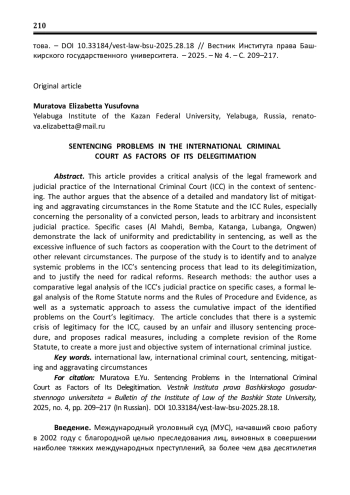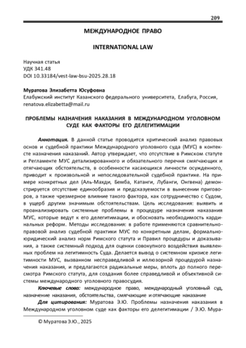 2. Муратова Э.Ю. Назначение наказания в Международном Уголовном Суде / Э.Ю. Муратова // Вестник ТИСБИ. - 2021. - № 1. - С. 149-155. EDN: QKAQCW