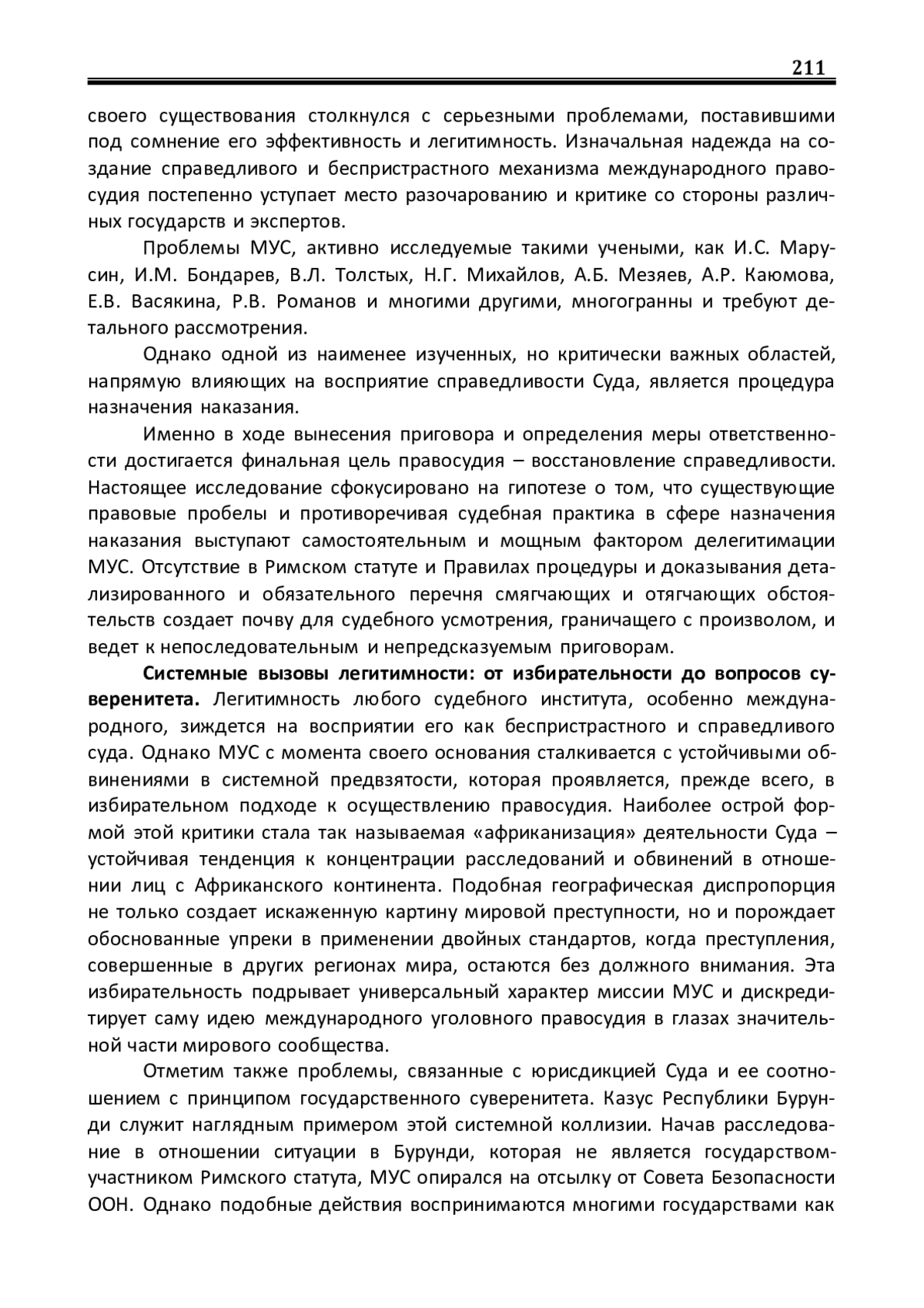Введение. Международный уголовный суд (МУС), начавший свою работу в 2002 году с благородной целью преследования лиц, виновных в совершении наиболее тяжких международных преступлений, за более чем два десятилетиясвоего существования столкнулся с серьезными проблемами, поставившими под сомнение его эффективность и легитимность. Изначальная надежда на создание справедливого и беспристрастного механизма международного правосудия постепенно уступает место разочарованию и критике со стороны различных государств и экспертов
