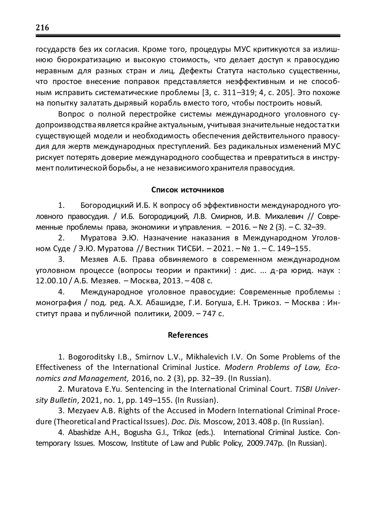 1. Богородицкий И.Б. К вопросу об эффективности международного уголовного правосудия. / И.Б. Богородицкий, Л.В. Смирнов, И.В. Михалевич // Современные проблемы права, экономики и управления. - 2016. - № 2 (3). - С. 32-39. EDN: XSCRHH