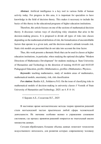 Поэтому данная статья посвящена одному из разделов математической теории принятия решений. В ней рассматриваются различные способы классификации рисковых ситуаций, которые возникают в процессе принятия решений, и предлагается разделить все типы рисков на классы в зависимости от математического определения риска, формализации неконтролируемых факторов, действующих в данной задаче, отношения лица, принимающего решение, к риску. Здесь представлены статические модели риска, в которых не учитывается фактор времени.