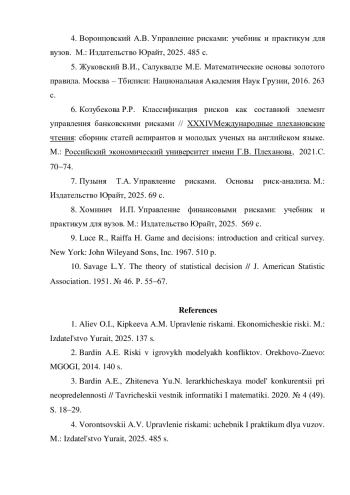1. Алиев О.И., Кипкеева А.М. Управление рисками. Экономические риски. М.: Издательство Юрайт, 2025. 137 с.