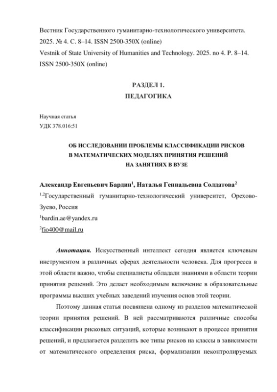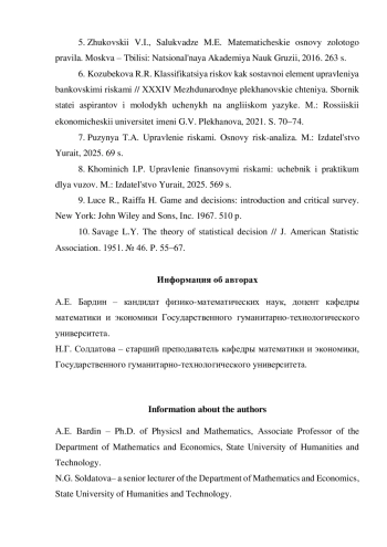 2. Бардин А.Е. Риски в игровых моделях конфликтов. Орехово-Зуево: МГОГИ, 2014. 140 с. EDN: UGKBOX