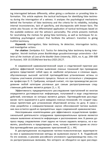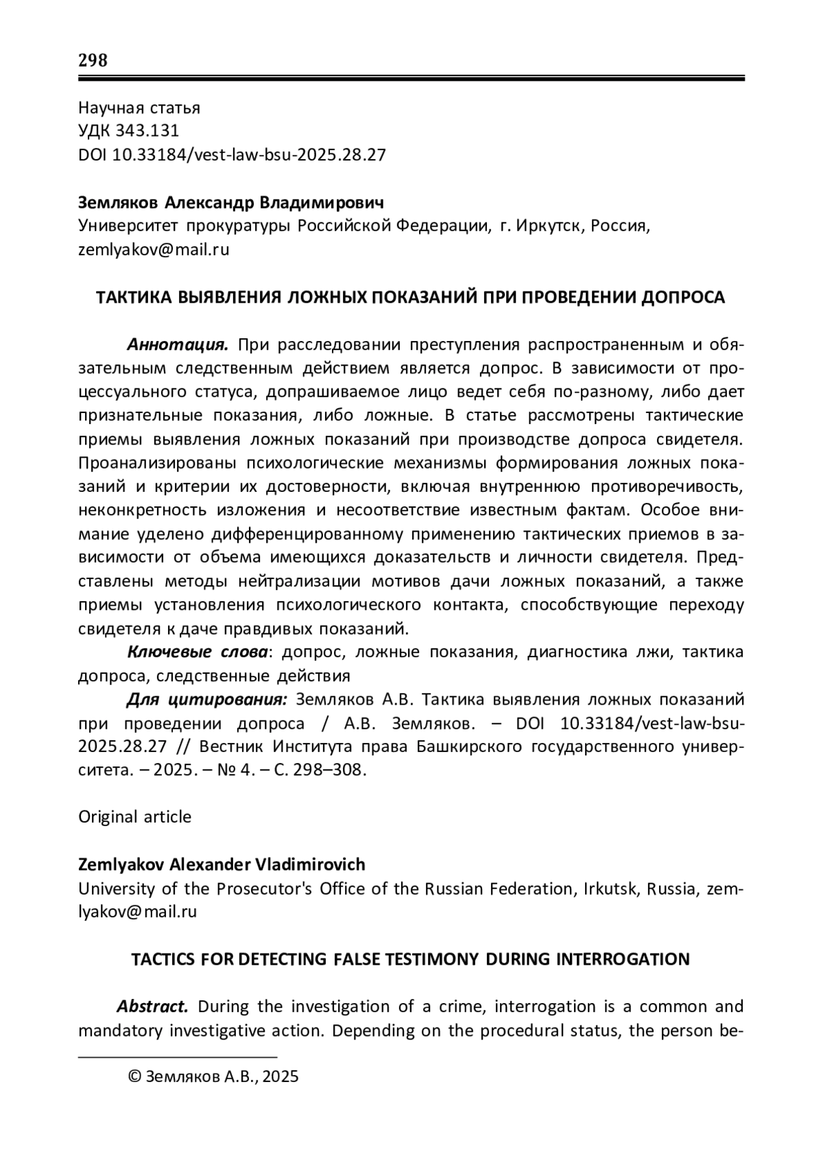 8. Психологические приемы изобличения лжи и лжесвидетельств в юриспруденции / Н. Ю. Зебзеева // Молодежь и наука: сборник материалов IХ Всероссийской научно-технической конференции студентов, аспирантов и молодых ученых с международным участием, посвященной 385-летию со дня основания г. Красноярска [Электронный ресурс]. - Красноярск: Сибирский федеральный ун-т, 2013: сайт.URL: http://conf.sfu-kras.ru/sites/mn2013/section025.html (дата обращения 01.11.2025).