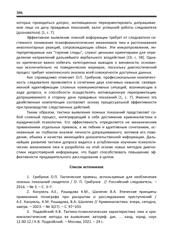 1. Грибунов О.П. Тактические приемы, используемые для изобличения ложных показаний свидетеля / О. П. Грибунов // Российский следователь. - 2016. - № 5. - С. 3-7. EDN: VOCHAF